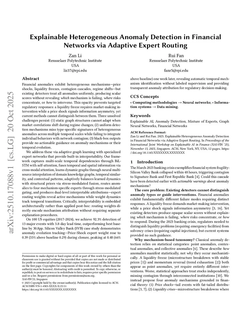 Financial anomalies exhibit heterogeneous mechanisms (price shocks, liquidity freezes, contagion cascades, regime shifts), but existing detectors treat all anomalies uniformly, producing scalar scores without revealing which mechanism is failing, where risks concentrate, or how to intervene. This opacity prevents targeted regulatory responses. Three unsolved challenges persist: (1) static graph structures cannot adapt when market correlations shift during regime changes; (2) uniform detection mechanisms miss type-specific signatures across multiple temporal scales while failing to integrate individual behaviors with network contagion; (3) black-box outputs provide no actionable guidance on anomaly mechanisms or their temporal evolution.We address these via adaptive graph learning with specialized expert networks that provide built-in interpretability. Our framework captures multi-scale temporal dependencies through BiLSTM with self-attention, fuses temporal and spatial information via cross-modal attention, learns dynamic graphs through neural multi-source interpolation, adaptively balances learned dynamics with structural priors via stress-modulated fusion, routes anomalies to four mechanism-specific experts, and produces dual-level interpretable attributions. Critically, interpretability is embedded architecturally rather than applied post-hoc.On 100 US equities (2017-2024), we achieve 92.3% detection of 13 major events with 3.8-day lead time, outperforming best baseline by 30.8pp. Silicon Valley Bank case study demonstrates anomaly evolution tracking: Price-Shock expert weight rose to 0.39 (33% above baseline 0.29) during closure, peaking at 0.48 (66% above baseline) one week later, revealing automatic temporal mechanism identification without labeled supervision.