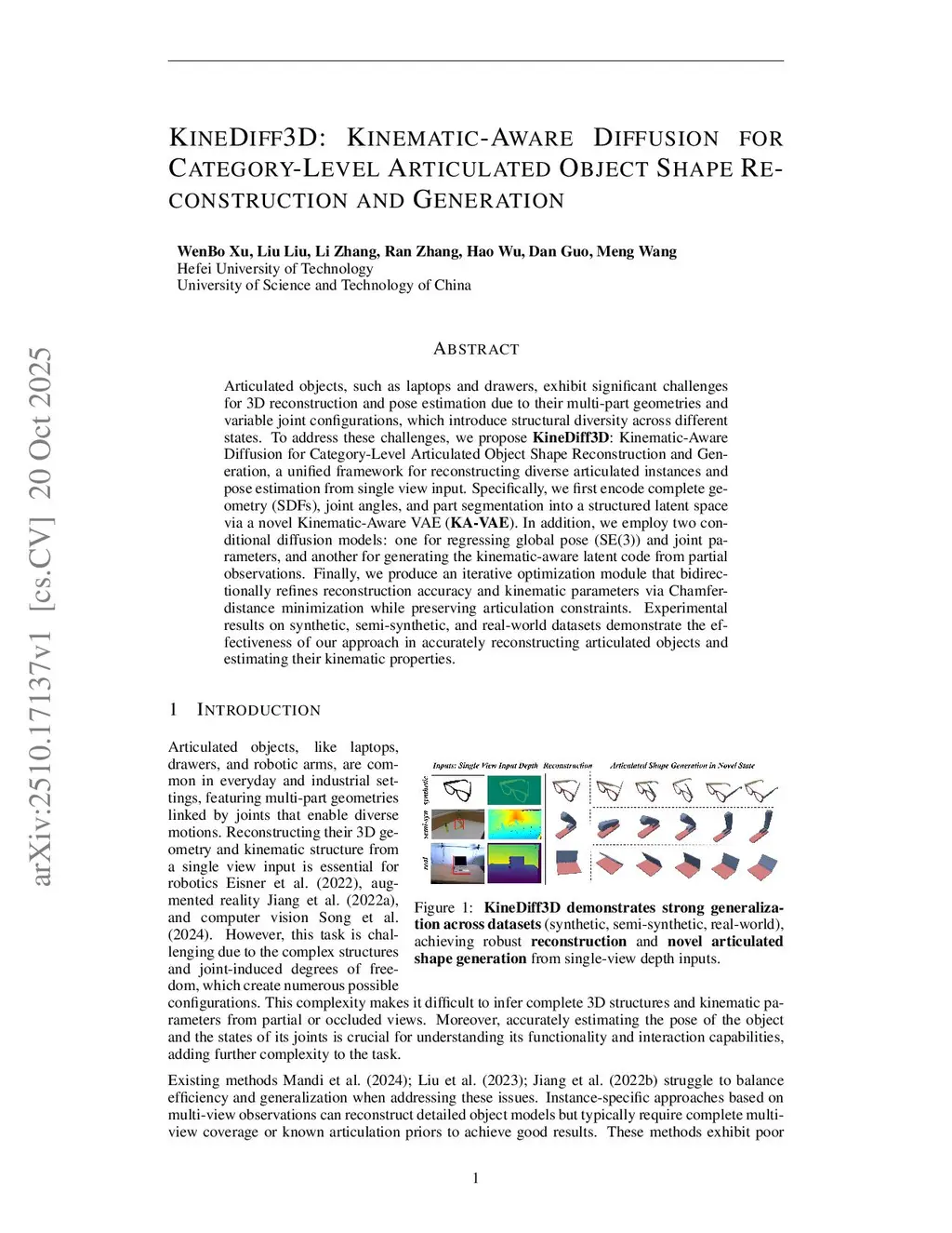 KineDiff3D: Kinematic-Aware Diffusion for Category-Level Articulated Object Shape Reconstruction and Generation