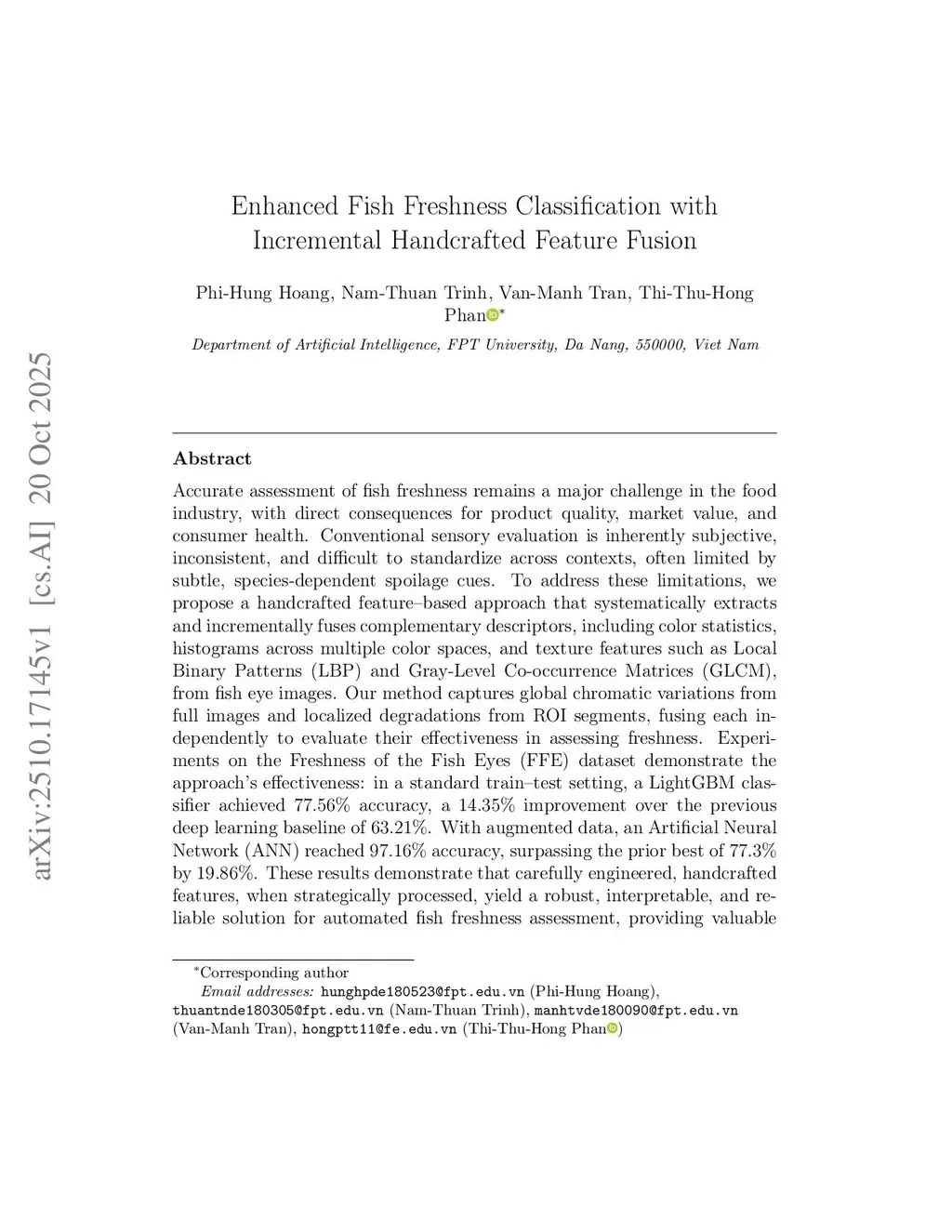 Accurate assessment of fish freshness remains a major challenge in the food industry, with direct consequences for product quality, market value, and consumer health. Conventional sensory evaluation is inherently subjective, inconsistent, and difficult to standardize across contexts, often limited by subtle, species-dependent spoilage cues. To address these limitations, we propose a handcrafted feature-based approach that systematically extracts and incrementally fuses complementary descriptors, including color statistics, histograms across multiple color spaces, and texture features such as Local Binary Patterns (LBP) and Gray-Level Co-occurrence Matrices (GLCM), from fish eye images. Our method captures global chromatic variations from full images and localized degradations from ROI segments, fusing each independently to evaluate their effectiveness in assessing freshness. Experiments on the Freshness of the Fish Eyes (FFE) dataset demonstrate the approach's effectiveness: in a standard train-test setting, a LightGBM classifier achieved 77.56% accuracy, a 14.35% improvement over the previous deep learning baseline of 63.21%. With augmented data, an Artificial Neural Network (ANN) reached 97.49% accuracy, surpassing the prior best of 77.3% by 20.19%. These results demonstrate that carefully engineered, handcrafted features, when strategically processed, yield a robust, interpretable, and reliable solution for automated fish freshness assessment, providing valuable insights for practical applications in food quality monitoring.