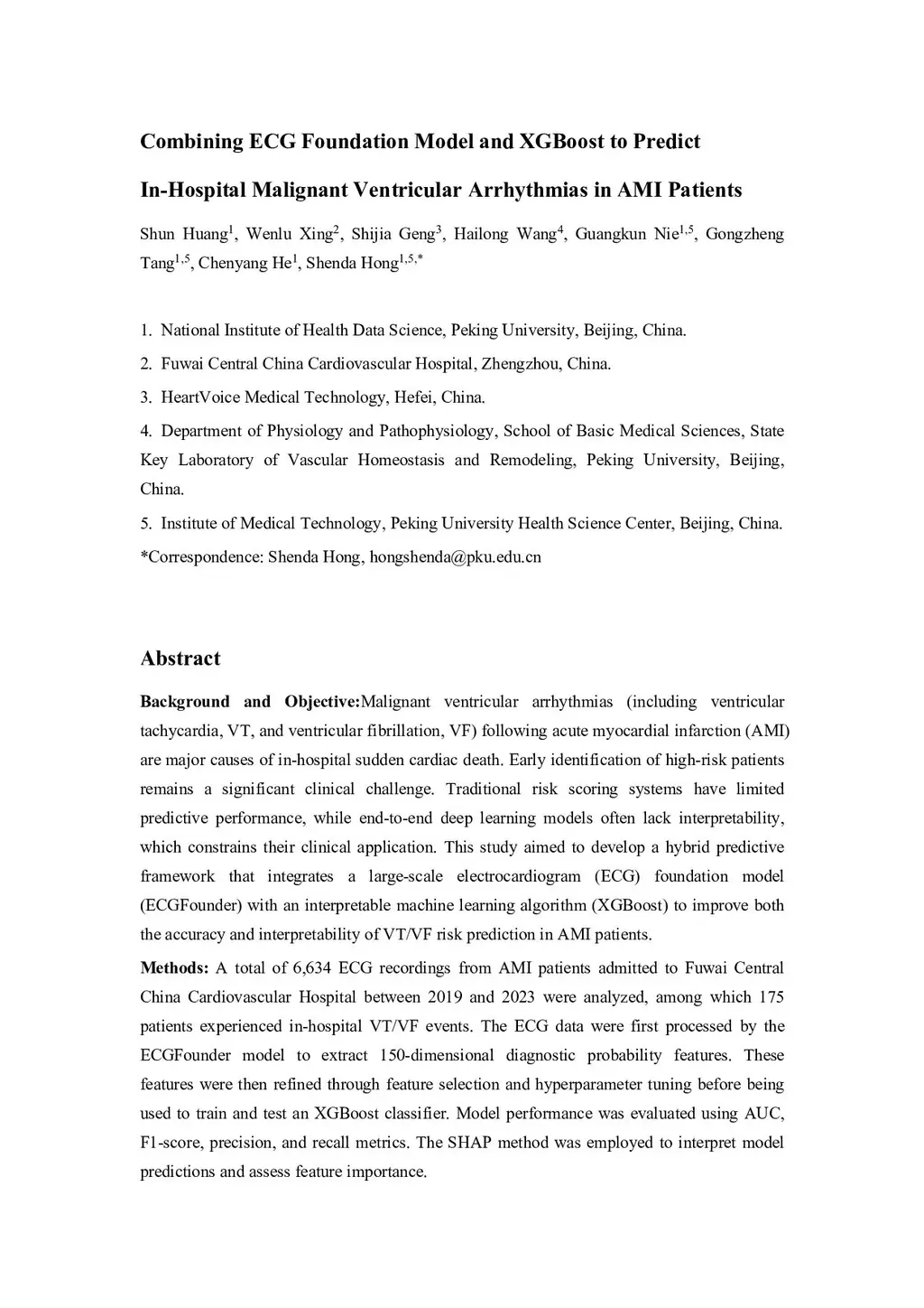Malignant ventricular arrhythmias (VT/VF) following acute myocardial infarction (AMI) are a major cause of in-hospital death, yet early identification remains a clinical challenge. While traditional risk scores have limited performance, end-to-end deep learning models often lack the interpretability needed for clinical trust. This study aimed to develop a hybrid predictive framework that integrates a large-scale electrocardiogram (ECG) foundation model (ECGFounder) with an interpretable XGBoost classifier to improve both accuracy and interpretability. We analyzed 6,634 ECG recordings from AMI patients, among whom 175 experienced in-hospital VT/VF. The ECGFounder model was used to extract 150-dimensional diagnostic probability features , which were then refined through feature selection to train the XGBoost classifier. Model performance was evaluated using AUC and F1-score , and the SHAP method was used for interpretability. The ECGFounder + XGBoost hybrid model achieved an AUC of 0.801 , outperforming KNN (AUC 0.677), RNN (AUC 0.676), and an end-to-end 1D-CNN (AUC 0.720). SHAP analysis revealed that model-identified key features, such as "premature ventricular complexes" (risk predictor) and "normal sinus rhythm" (protective factor), were highly consistent with clinical knowledge. We conclude that this hybrid framework provides a novel paradigm for VT/VF risk prediction by validating the use of foundation model outputs as effective, automated feature engineering for building trustworthy, explainable AI-based clinical decision support systems.