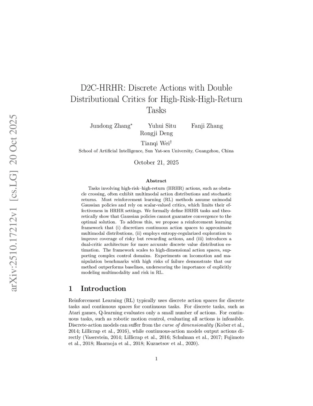 Tasks involving high-risk-high-return (HRHR) actions, such as obstacle crossing, often exhibit multimodal action distributions and stochastic returns. Most reinforcement learning (RL) methods assume unimodal Gaussian policies and rely on scalar-valued critics, which limits their effectiveness in HRHR settings. We formally define HRHR tasks and theoretically show that Gaussian policies cannot guarantee convergence to the optimal solution. To address this, we propose a reinforcement learning framework that (i) discretizes continuous action spaces to approximate multimodal distributions, (ii) employs entropy-regularized exploration to improve coverage of risky but rewarding actions, and (iii) introduces a dual-critic architecture for more accurate discrete value distribution estimation. The framework scales to high-dimensional action spaces, supporting complex control domains. Experiments on locomotion and manipulation benchmarks with high risks of failure demonstrate that our method outperforms baselines, underscoring the importance of explicitly modeling multimodality and risk in RL.