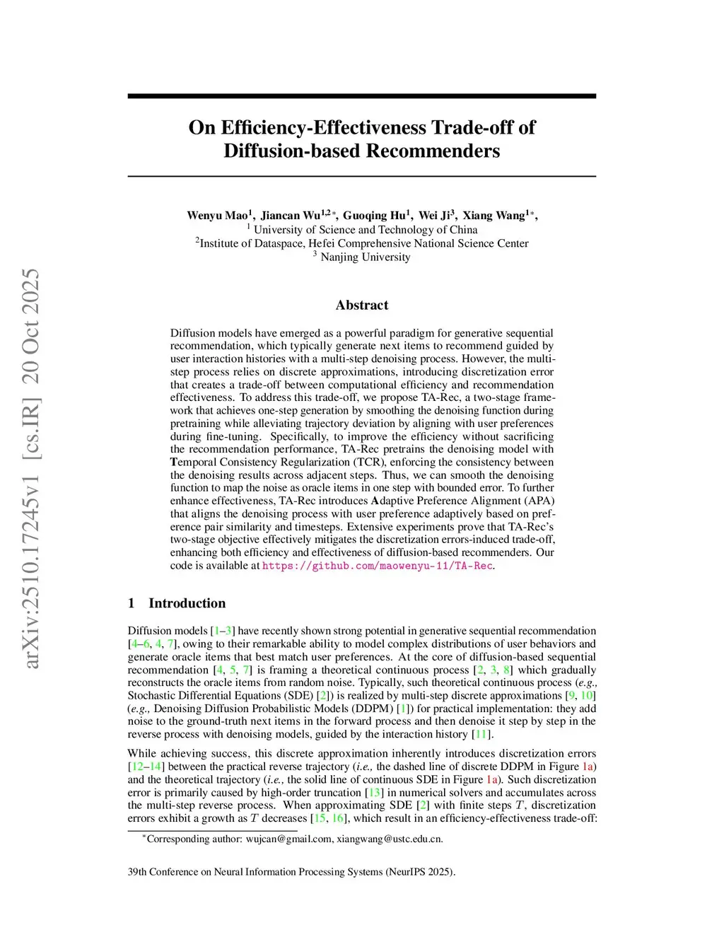 Diffusion models have emerged as a powerful paradigm for generative sequential recommendation, which typically generate next items to recommend guided by user interaction histories with a multi-step denoising process. However, the multi-step process relies on discrete approximations, introducing discretization error that creates a trade-off between computational efficiency and recommendation effectiveness. To address this trade-off, we propose TA-Rec, a two-stage framework that achieves one-step generation by smoothing the denoising function during pretraining while alleviating trajectory deviation by aligning with user preferences during fine-tuning. Specifically, to improve the efficiency without sacrificing the recommendation performance, TA-Rec pretrains the denoising model with Temporal Consistency Regularization (TCR), enforcing the consistency between the denoising results across adjacent steps. Thus, we can smooth the denoising function to map the noise as oracle items in one step with bounded error. To further enhance effectiveness, TA-Rec introduces Adaptive Preference Alignment (APA) that aligns the denoising process with user preference adaptively based on preference pair similarity and timesteps. Extensive experiments prove that TA-Rec's two-stage objective effectively mitigates the discretization errors-induced trade-off, enhancing both efficiency and effectiveness of diffusion-based recommenders.