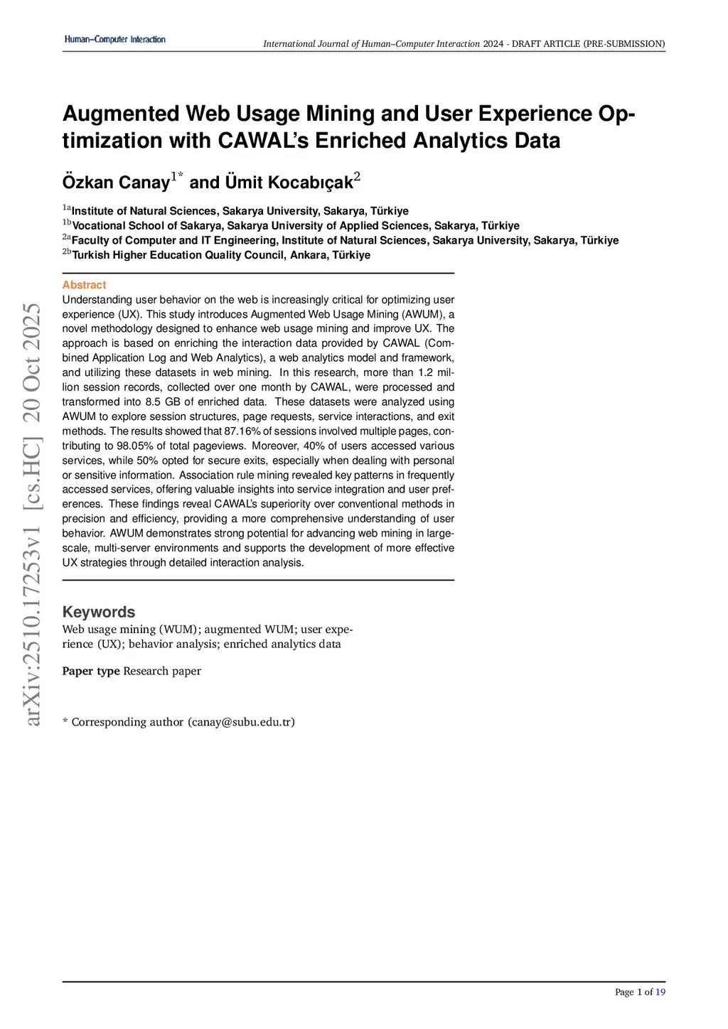 Understanding user behavior on the web is increasingly critical for optimizing user experience (UX). This study introduces Augmented Web Usage Mining (AWUM), a methodology designed to enhance web usage mining and improve UX by enriching the interaction data provided by CAWAL (Combined Application Log and Web Analytics), a framework for advanced web analytics. Over 1.2 million session records collected in one month (~8.5GB of data) were processed and transformed into enriched datasets. AWUM analyzes session structures, page requests, service interactions, and exit methods. Results show that 87.16% of sessions involved multiple pages, contributing 98.05% of total pageviews; 40% of users accessed various services and 50% opted for secure exits. Association rule mining revealed patterns of frequently accessed services, highlighting CAWAL's precision and efficiency over conventional methods. AWUM offers a comprehensive understanding of user behavior and strong potential for large-scale UX optimization.