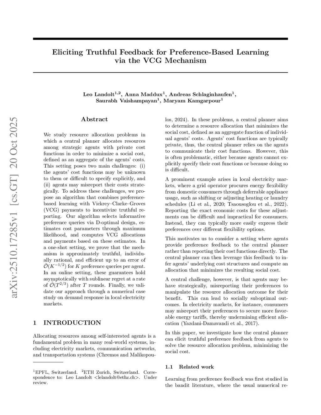We study resource allocation problems in which a central planner allocates resources among strategic agents with private cost functions in order to minimize a social cost, defined as an aggregate of the agents' costs. This setting poses two main challenges: (i) the agents' cost functions may be unknown to them or difficult to specify explicitly, and (ii) agents may misreport their costs strategically. To address these challenges, we propose an algorithm that combines preference-based learning with Vickrey-Clarke-Groves (VCG) payments to incentivize truthful reporting. Our algorithm selects informative preference queries via D-optimal design, estimates cost parameters through maximum likelihood, and computes VCG allocations and payments based on these estimates. In a one-shot setting, we prove that the mechanism is approximately truthful, individually rational, and efficient up to an error of for preference queries per agent. In an online setting, these guarantees hold asymptotically with sublinear regret at a rate of after rounds. Finally, we validate our approach through a numerical case study on demand response in local electricity markets.