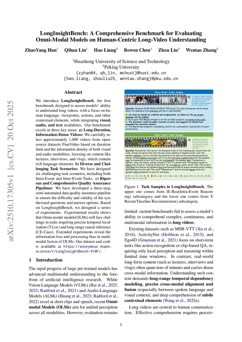 We introduce \textbf{LongInsightBench}, the first benchmark designed to assess models' ability to understand long videos, with a focus on human language, viewpoints, actions, and other contextual elements, while integrating \textbf{visual, audio, and text} modalities. Our benchmark excels in three key areas: \textbf{a) Long-Duration, Information-Dense Videos:} We carefully select approximately 1,000 videos from open-source datasets FineVideo based on duration limit and the information density of both visual and audio modalities, focusing on content like lectures, interviews, and vlogs, which contain rich language elements. \textbf{b) Diverse and Challenging Task Scenarios:} We have designed six challenging task scenarios, including both Intra-Event and Inter-Event Tasks. \textbf{c) Rigorous and Comprehensive Quality Assurance Pipelines:} We have developed a three-step, semi-automated data quality assurance pipeline to ensure the difficulty and validity of the synthesized questions and answer options. Based on LongInsightBench, we designed a series of experiments. Experimental results shows that Omni-modal models(OLMs) still face challenge in tasks requiring precise temporal localization (T-Loc) and long-range causal inference (CE-Caus). Extended experiments reveal the information loss and processing bias in multi-modal fusion of OLMs. Our dataset and code is available atthis https URL.