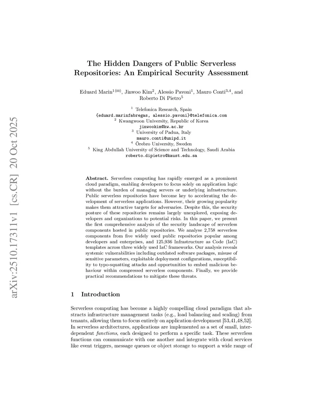 Serverless computing has rapidly emerged as a prominent cloud paradigm, enabling developers to focus solely on application logic without the burden of managing servers or underlying infrastructure. Public serverless repositories have become key to accelerating the development of serverless applications. However, their growing popularity makes them attractive targets for adversaries. Despite this, the security posture of these repositories remains largely unexplored, exposing developers and organizations to potential risks. In this paper, we present the first comprehensive analysis of the security landscape of serverless components hosted in public repositories. We analyse 2,758 serverless components from five widely used public repositories popular among developers and enterprises, and 125,936 Infrastructure as Code (IaC) templates across three widely used IaC frameworks. Our analysis reveals systemic vulnerabilities including outdated software packages, misuse of sensitive parameters, exploitable deployment configurations, susceptibility to typo-squatting attacks and opportunities to embed malicious behaviour within compressed serverless components. Finally, we provide practical recommendations to mitigate these threats.