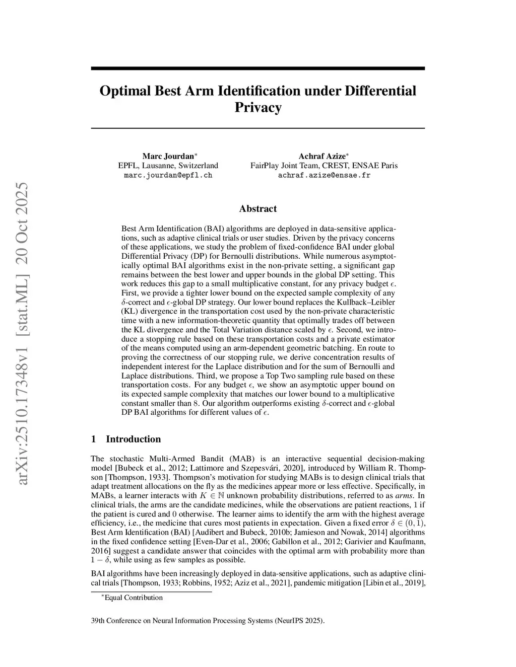 Best Arm Identification (BAI) algorithms are deployed in data-sensitive applications, such as adaptive clinical trials or user studies. Driven by the privacy concerns of these applications, we study the problem of fixed-confidence BAI under global Differential Privacy (DP) for Bernoulli distributions. While numerous asymptotically optimal BAI algorithms exist in the non-private setting, a significant gap remains between the best lower and upper bounds in the global DP setting. This work reduces this gap to a small multiplicative constant, for any privacy budget . First, we provide a tighter lower bound on the expected sample complexity of any -correct and -global DP strategy. Our lower bound replaces the Kullback-Leibler (KL) divergence in the transportation cost used by the non-private characteristic time with a new information-theoretic quantity that optimally trades off between the KL divergence and the Total Variation distance scaled by . Second, we introduce a stopping rule based on these transportation costs and a private estimator of the means computed using an arm-dependent geometric batching. En route to proving the correctness of our stopping rule, we derive concentration results of independent interest for the Laplace distribution and for the sum of Bernoulli and Laplace distributions. Third, we propose a Top Two sampling rule based on these transportation costs. For any budget , we show an asymptotic upper bound on its expected sample complexity that matches our lower bound to a multiplicative constant smaller than . Our algorithm outperforms existing -correct and -global DP BAI algorithms for different values of .