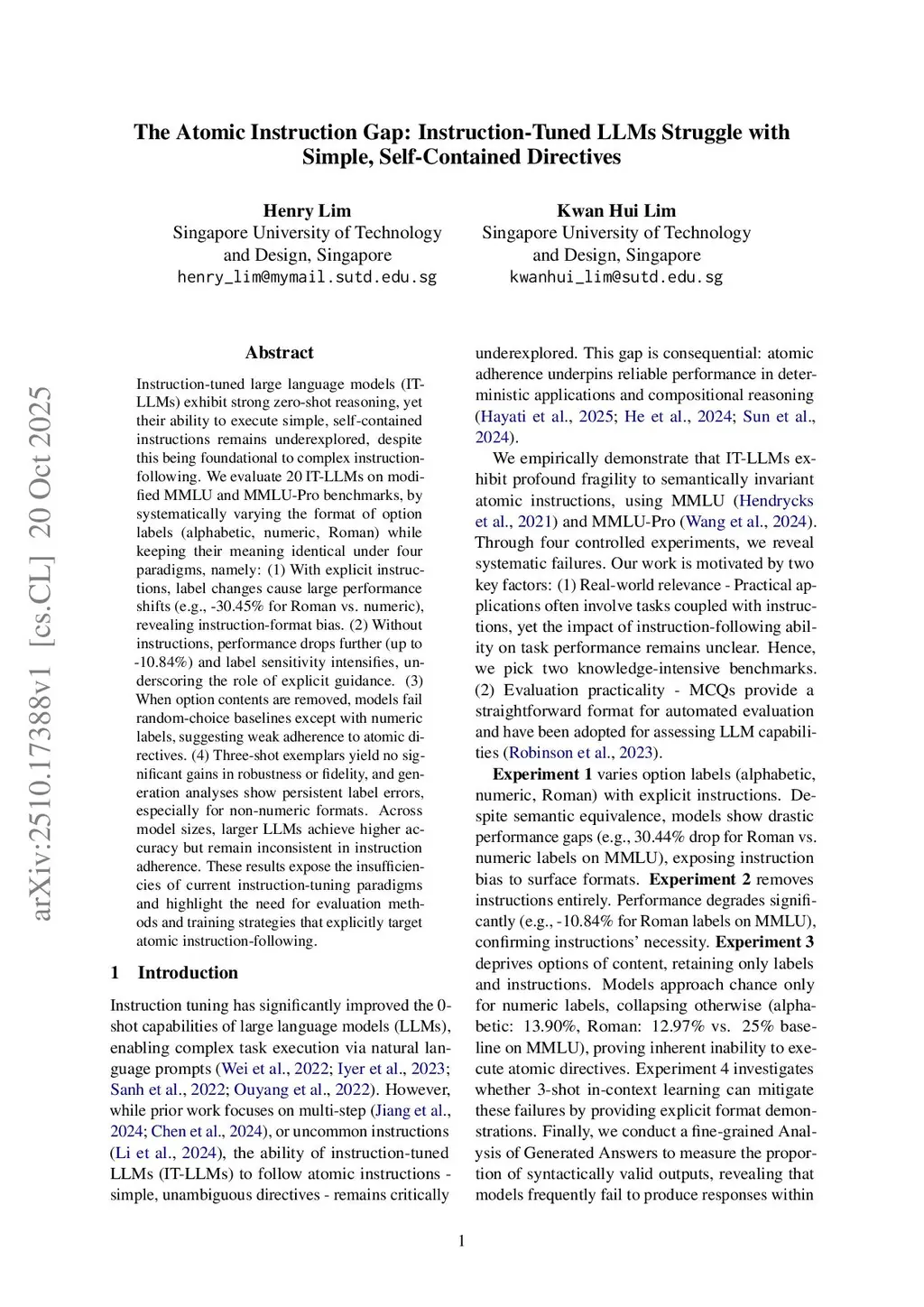 Instruction-tuned large language models (IT-LLMs) exhibit strong zero-shot reasoning, yet their ability to execute simple, self-contained instructions remains underexplored, despite this being foundational to complex instruction-following. We evaluate 20 IT-LLMs on modified MMLU and MMLU-Pro benchmarks, by systematically varying the format of option labels (alphabetic, numeric, Roman) while keeping their meaning identical under four paradigms, namely: (1) With explicit instructions, label changes cause large performance shifts (e.g., -30.45\% for Roman vs. numeric), revealing instruction-format bias. (2) Without instructions, performance drops further (up to -10.84\%) and label sensitivity intensifies, underscoring the role of explicit guidance. (3) When option contents are removed, models fail random-choice baselines except with numeric labels, suggesting weak adherence to atomic directives. (4) Three-shot exemplars yield no significant gains in robustness or fidelity, and generation analyses show persistent label errors, especially for non-numeric formats. Across model sizes, larger LLMs achieve higher accuracy but remain inconsistent in instruction adherence. These results expose the insufficiencies of current instruction-tuning paradigms and highlight the need for evaluation methods and training strategies that explicitly target atomic instruction-following.