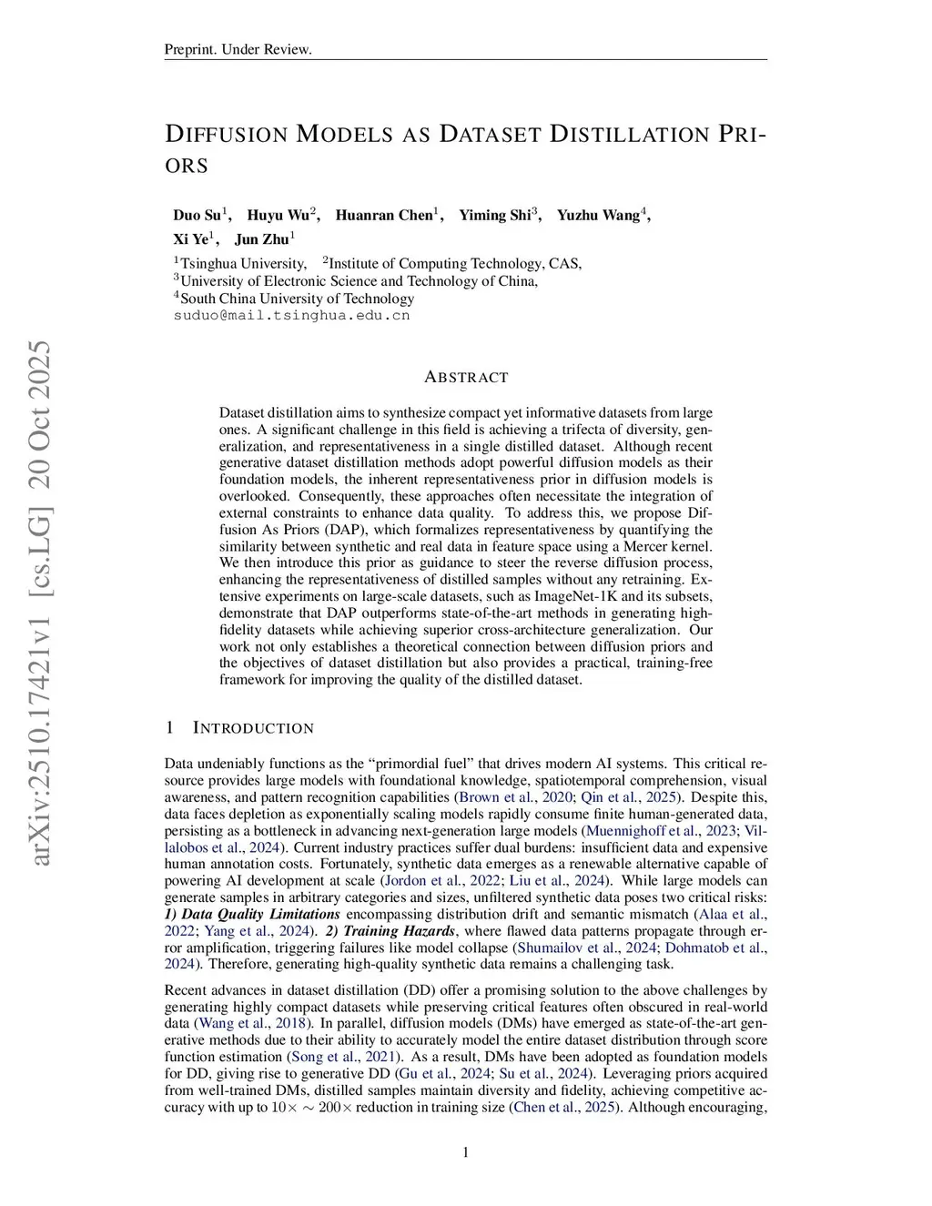 Dataset distillation aims to synthesize compact yet informative datasets from large ones. A significant challenge in this field is achieving a trifecta of diversity, generalization, and representativeness in a single distilled dataset. Although recent generative dataset distillation methods adopt powerful diffusion models as their foundation models, the inherent representativeness prior in diffusion models is overlooked. Consequently, these approaches often necessitate the integration of external constraints to enhance data quality. To address this, we propose Diffusion As Priors (DAP), which formalizes representativeness by quantifying the similarity between synthetic and real data in feature space using a Mercer kernel. We then introduce this prior as guidance to steer the reverse diffusion process, enhancing the representativeness of distilled samples without any retraining. Extensive experiments on large-scale datasets, such as ImageNet-1K and its subsets, demonstrate that DAP outperforms state-of-the-art methods in generating high-fidelity datasets while achieving superior cross-architecture generalization. Our work not only establishes a theoretical connection between diffusion priors and the objectives of dataset distillation but also provides a practical, training-free framework for improving the quality of the distilled dataset.