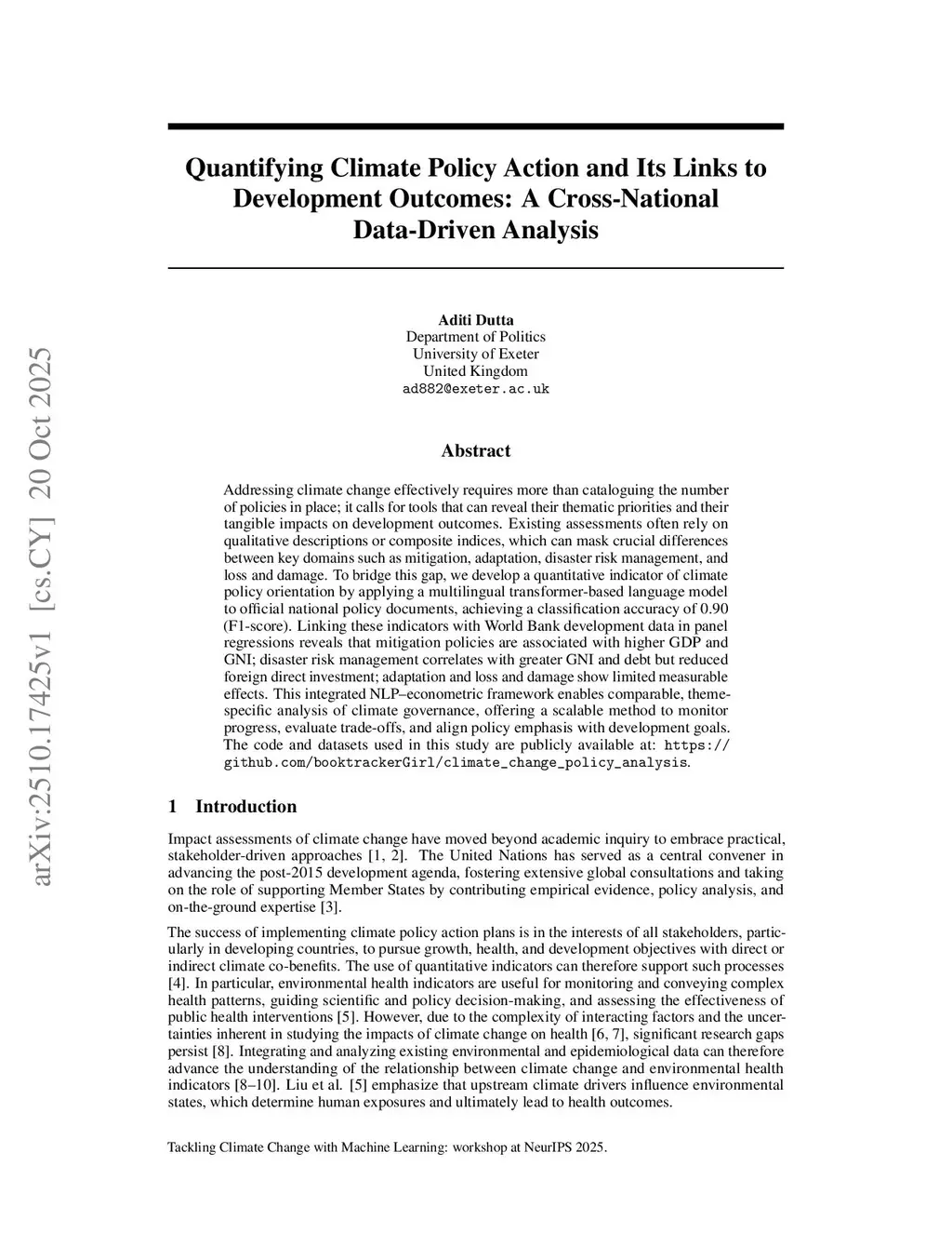 Addressing climate change effectively requires more than cataloguing the number of policies in place; it calls for tools that can reveal their thematic priorities and their tangible impacts on development outcomes. Existing assessments often rely on qualitative descriptions or composite indices, which can mask crucial differences between key domains such as mitigation, adaptation, disaster risk management, and loss and damage. To bridge this gap, we develop a quantitative indicator of climate policy orientation by applying a multilingual transformer-based language model to official national policy documents, achieving a classification accuracy of 0.90 (F1-score). Linking these indicators with World Bank development data in panel regressions reveals that mitigation policies are associated with higher GDP and GNI; disaster risk management correlates with greater GNI and debt but reduced foreign direct investment; adaptation and loss and damage show limited measurable effects. This integrated NLP-econometric framework enables comparable, theme-specific analysis of climate governance, offering a scalable method to monitor progress, evaluate trade-offs, and align policy emphasis with development goals.