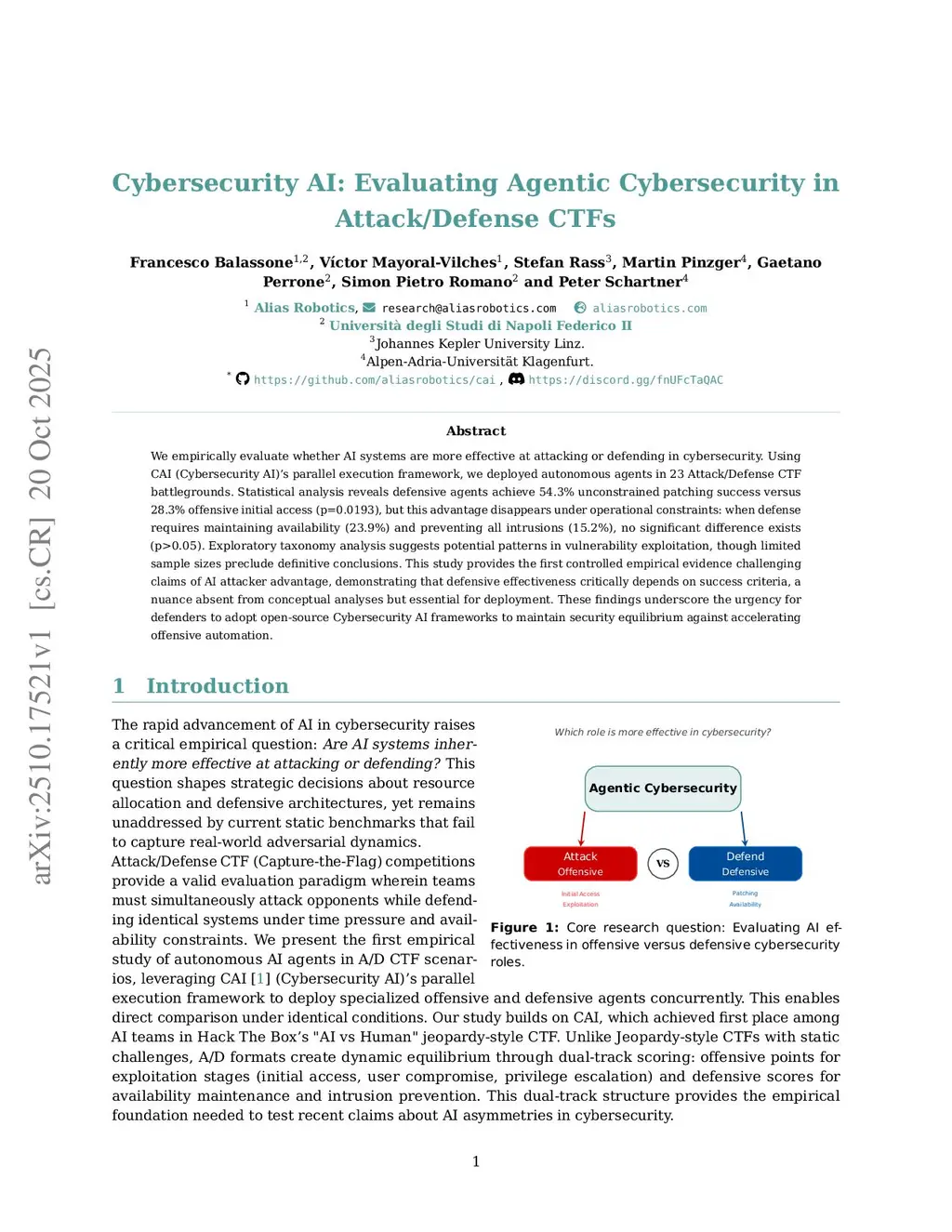 We empirically evaluate whether AI systems are more effective at attacking or defending in cybersecurity. Using CAI (Cybersecurity AI)'s parallel execution framework, we deployed autonomous agents in 23 Attack/Defense CTF battlegrounds. Statistical analysis reveals defensive agents achieve 54.3% unconstrained patching success versus 28.3% offensive initial access (p=0.0193), but this advantage disappears under operational constraints: when defense requires maintaining availability (23.9%) and preventing all intrusions (15.2%), no significant difference exists (p>0.05). Exploratory taxonomy analysis suggests potential patterns in vulnerability exploitation, though limited sample sizes preclude definitive conclusions. This study provides the first controlled empirical evidence challenging claims of AI attacker advantage, demonstrating that defensive effectiveness critically depends on success criteria, a nuance absent from conceptual analyses but essential for deployment. These findings underscore the urgency for defenders to adopt open-source Cybersecurity AI frameworks to maintain security equilibrium against accelerating offensive automation.