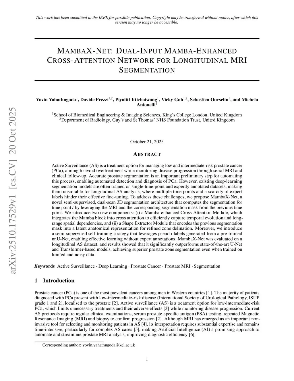 Active Surveillance (AS) is a treatment option for managing low and intermediate-risk prostate cancer (PCa), aiming to avoid overtreatment while monitoring disease progression through serial MRI and clinical follow-up. Accurate prostate segmentation is an important preliminary step for automating this process, enabling automated detection and diagnosis of PCa. However, existing deep-learning segmentation models are often trained on single-time-point and expertly annotated datasets, making them unsuitable for longitudinal AS analysis, where multiple time points and a scarcity of expert labels hinder their effective fine-tuning. To address these challenges, we propose MambaX-Net, a novel semi-supervised, dual-scan 3D segmentation architecture that computes the segmentation for time point t by leveraging the MRI and the corresponding segmentation mask from the previous time point. We introduce two new components: (i) a Mamba-enhanced Cross-Attention Module, which integrates the Mamba block into cross attention to efficiently capture temporal evolution and long-range spatial dependencies, and (ii) a Shape Extractor Module that encodes the previous segmentation mask into a latent anatomical representation for refined zone delination. Moreover, we introduce a semi-supervised self-training strategy that leverages pseudo-labels generated from a pre-trained nnU-Net, enabling effective learning without expert annotations. MambaX-Net was evaluated on a longitudinal AS dataset, and results showed that it significantly outperforms state-of-the-art U-Net and Transformer-based models, achieving superior prostate zone segmentation even when trained on limited and noisy data.