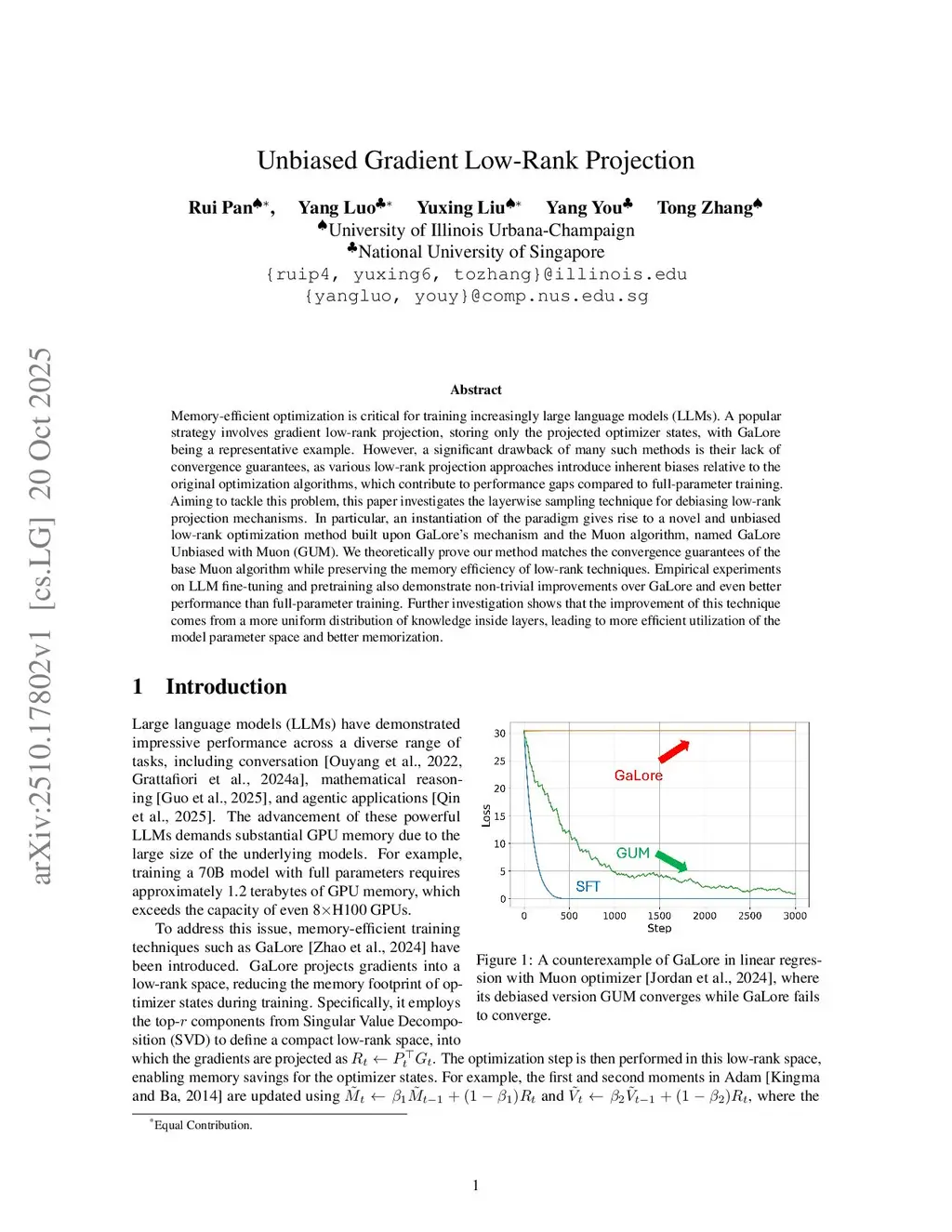 Memory-efficient optimization is critical for training increasingly large language models (LLMs). A popular strategy involves gradient low-rank projection, storing only the projected optimizer states, with GaLore being a representative example. However, a significant drawback of many such methods is their lack of convergence guarantees, as various low-rank projection approaches introduce inherent biases relative to the original optimization algorithms, which contribute to performance gaps compared to full-parameter training. Aiming to tackle this problem, this paper investigates the layerwise sampling technique for debiasing low-rank projection mechanisms. In particular, an instantiation of the paradigm gives rise to a novel and unbiased low-rank optimization method built upon GaLore's mechanism and the Muon algorithm, named GaLore Unbiased with Muon (GUM). We theoretically prove our method matches the convergence guarantees of the base Muon algorithm while preserving the memory efficiency of low-rank techniques. Empirical experiments on LLM fine-tuning and pretraining also demonstrate non-trivial improvements over GaLore and even better performance than full-parameter training. Further investigation shows that the improvement of this technique comes from a more uniform distribution of knowledge inside layers, leading to more efficient utilization of the model parameter space and better memorization.