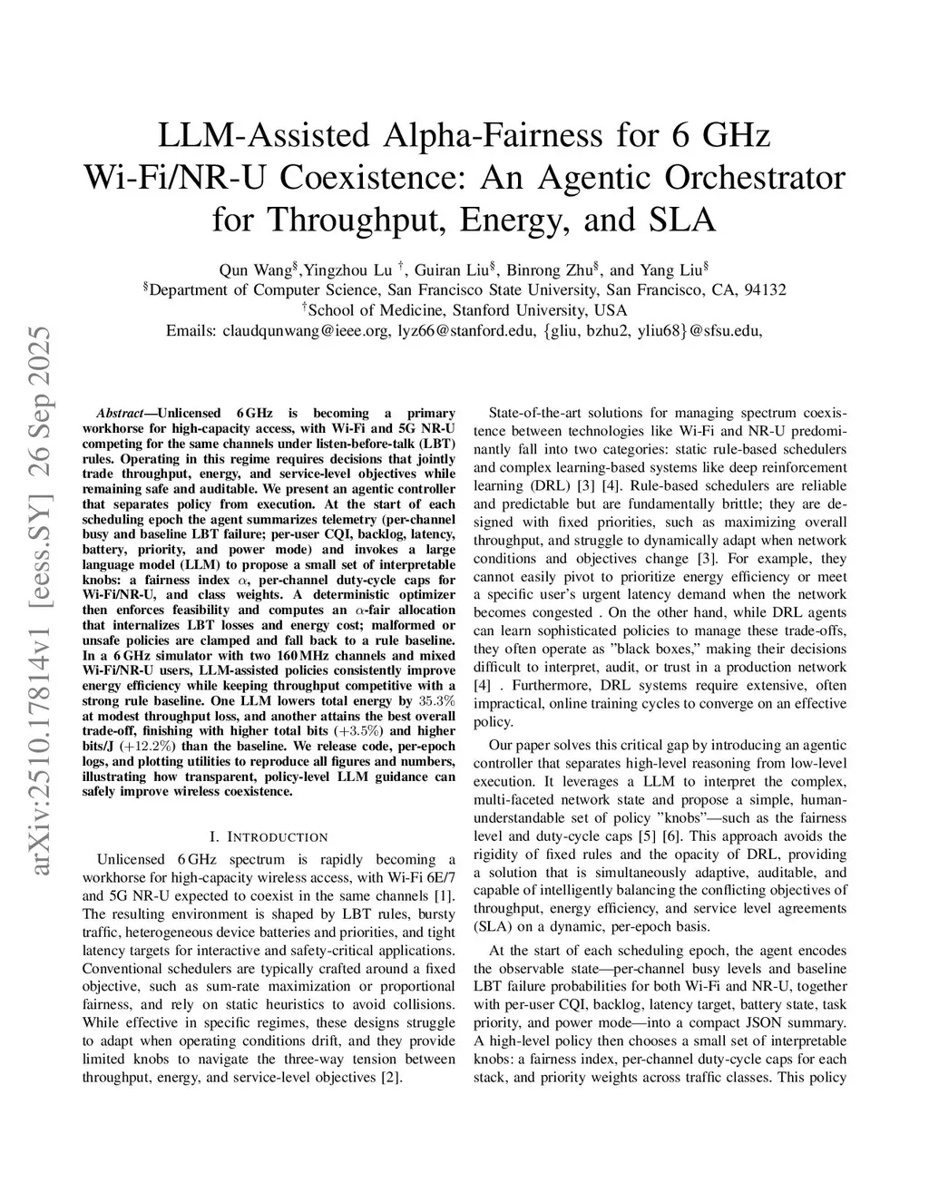 Unlicensed 6GHz is becoming a primary workhorse for high-capacity access, with Wi-Fi and 5G NR-U competing for the same channels under listen-before-talk (LBT) rules. Operating in this regime requires decisions that jointly trade throughput, energy, and service-level objectives while remaining safe and auditable. We present an agentic controller that separates {policy} from {execution}. At the start of each scheduling epoch the agent summarizes telemetry (per-channel busy and baseline LBT failure; per-user CQI, backlog, latency, battery, priority, and power mode) and invokes a large language model (LLM) to propose a small set of interpretable knobs: a fairness index \alpha, per-channel duty-cycle caps for Wi-Fi/NR-U, and class weights. A deterministic optimizer then enforces feasibility and computes an \alpha-fair allocation that internalizes LBT losses and energy cost; malformed or unsafe policies are clamped and fall back to a rule baseline. In a 6GHz simulator with two 160MHz channels and mixed Wi-Fi/NR-U users, LLM-assisted policies consistently improve energy efficiency while keeping throughput competitive with a strong rule baseline. One LLM lowers total energy by 35.3% at modest throughput loss, and another attains the best overall trade-off, finishing with higher total bits (+3.5%) and higher bits/J (+12.2%) than the baseline. We release code, per-epoch logs, and plotting utilities to reproduce all figures and numbers, illustrating how transparent, policy-level LLM guidance can safely improve wireless coexistence.
