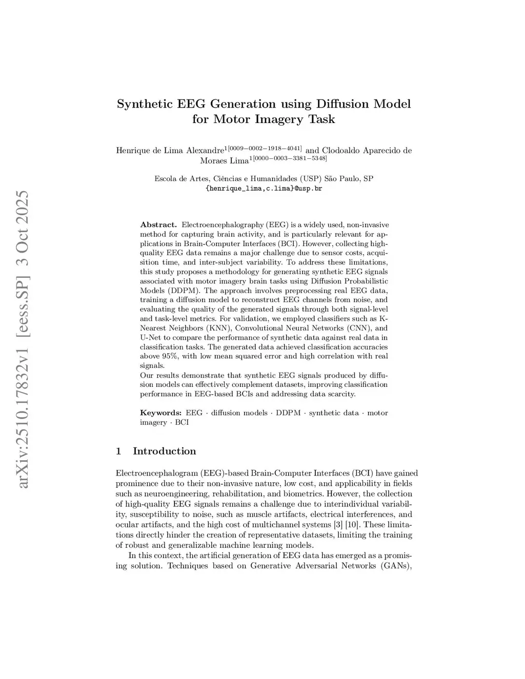 Electroencephalography (EEG) is a widely used, non-invasive method for capturing brain activity, and is particularly relevant for applications in Brain-Computer Interfaces (BCI). However, collecting high-quality EEG data remains a major challenge due to sensor costs, acquisition time, and inter-subject variability. To address these limitations, this study proposes a methodology for generating synthetic EEG signals associated with motor imagery brain tasks using Diffusion Probabilistic Models (DDPM). The approach involves preprocessing real EEG data, training a diffusion model to reconstruct EEG channels from noise, and evaluating the quality of the generated signals through both signal-level and task-level metrics. For validation, we employed classifiers such as K-Nearest Neighbors (KNN), Convolutional Neural Networks (CNN), and U-Net to compare the performance of synthetic data against real data in classification tasks. The generated data achieved classification accuracies above 95%, with low mean squared error and high correlation with real signals.Our results demonstrate that synthetic EEG signals produced by diffusion models can effectively complement datasets, improving classification performance in EEG-based BCIs and addressing data scarcity.