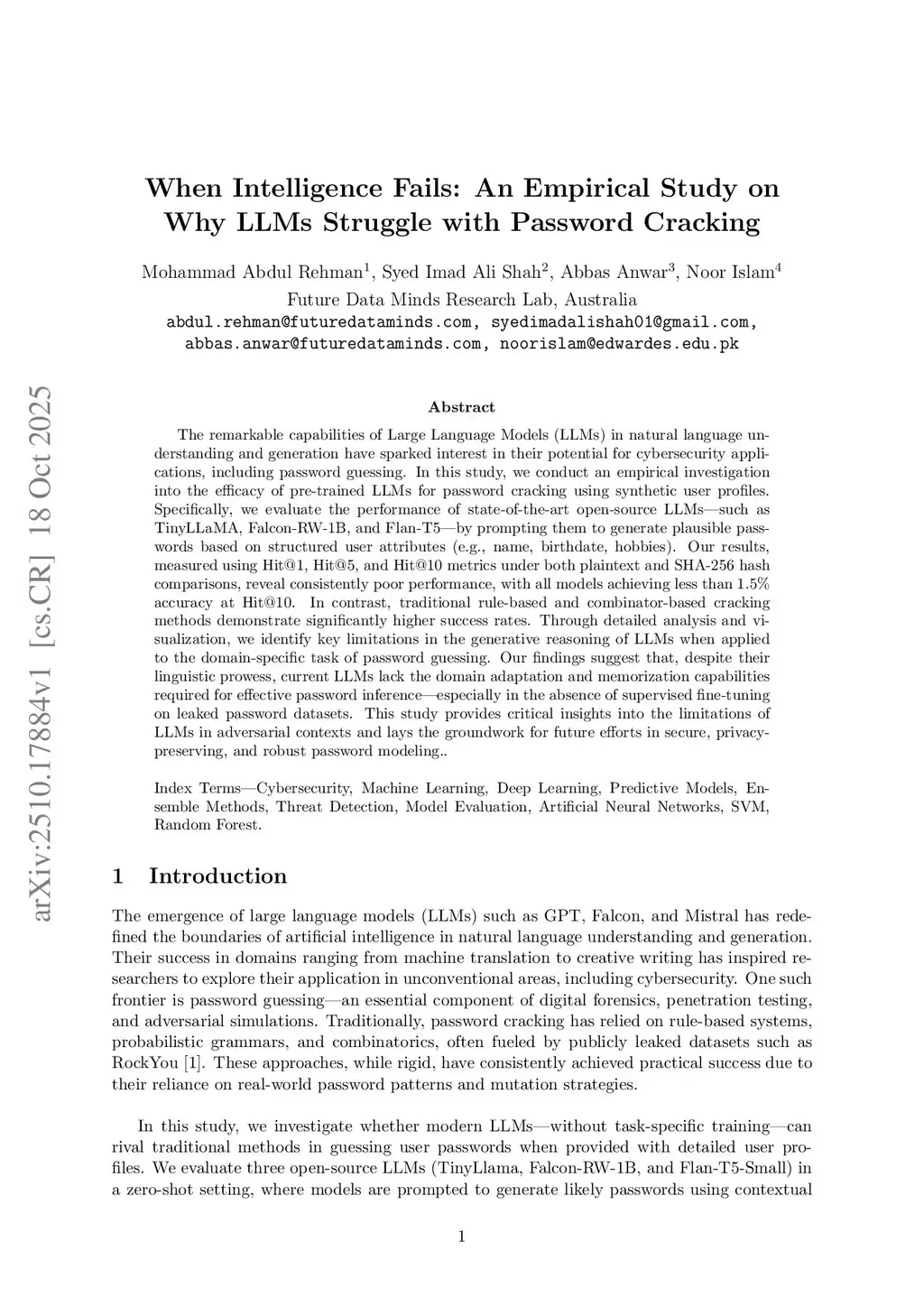 The remarkable capabilities of Large Language Models (LLMs) in natural language understanding and generation have sparked interest in their potential for cybersecurity applications, including password guessing. In this study, we conduct an empirical investigation into the efficacy of pre-trained LLMs for password cracking using synthetic user profiles. Specifically, we evaluate the performance of state-of-the-art open-source LLMs such as TinyLLaMA, Falcon-RW-1B, and Flan-T5 by prompting them to generate plausible passwords based on structured user attributes (e.g., name, birthdate, hobbies). Our results, measured using Hit@1, Hit@5, and Hit@10 metrics under both plaintext and SHA-256 hash comparisons, reveal consistently poor performance, with all models achieving less than 1.5% accuracy at Hit@10. In contrast, traditional rule-based and combinator-based cracking methods demonstrate significantly higher success rates. Through detailed analysis and visualization, we identify key limitations in the generative reasoning of LLMs when applied to the domain-specific task of password guessing. Our findings suggest that, despite their linguistic prowess, current LLMs lack the domain adaptation and memorization capabilities required for effective password inference, especially in the absence of supervised fine-tuning on leaked password datasets. This study provides critical insights into the limitations of LLMs in adversarial contexts and lays the groundwork for future efforts in secure, privacy-preserving, and robust password modeling.