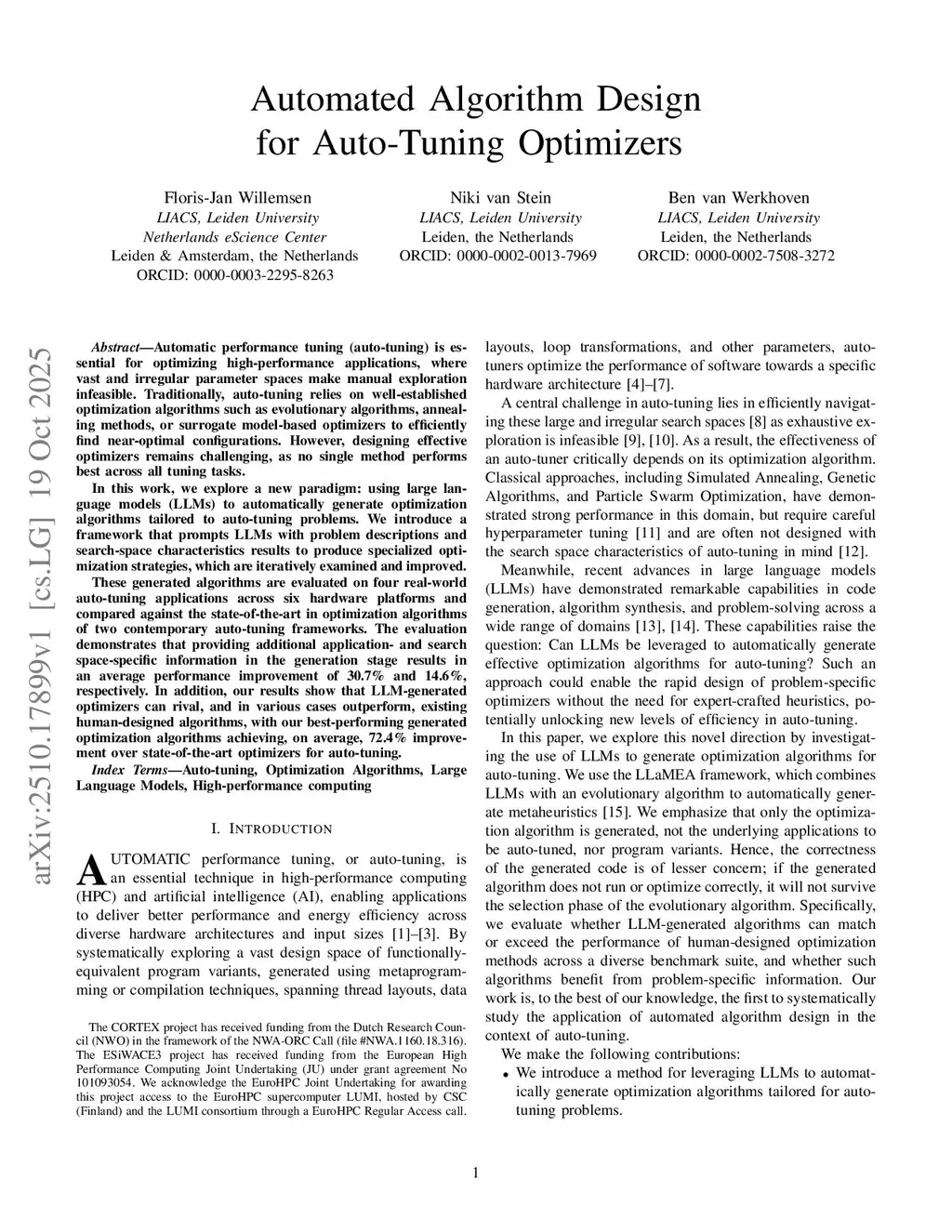 Automatic performance tuning (auto-tuning) is essential for optimizing high-performance applications, where vast and irregular search spaces make manual exploration infeasible. While auto-tuners traditionally rely on classical approaches such as evolutionary, annealing, or surrogate-based optimizers, designing algorithms that efficiently find near-optimal configurations robustly across diverse tasks is challenging. We propose a new paradigm: using large language models (LLMs) to automatically generate optimization algorithms tailored to auto-tuning problems. We introduce a framework that prompts LLMs with problem descriptions and search space characteristics to synthesize, test, and iteratively refine specialized optimizers. These generated algorithms are evaluated on four real-world auto-tuning applications across six hardware platforms and compared against the state-of-the-art in two contemporary auto-tuning frameworks. The evaluation demonstrates that providing additional application- and search space-specific information in the generation stage results in an average performance improvement of 30.7% and 14.6%, respectively. In addition, our results show that LLM-generated optimizers can rival, and in various cases outperform, existing human-designed algorithms, with our best-performing generated optimization algorithms achieving an average 72.4% improvement over state-of-the-art optimizers for auto-tuning.