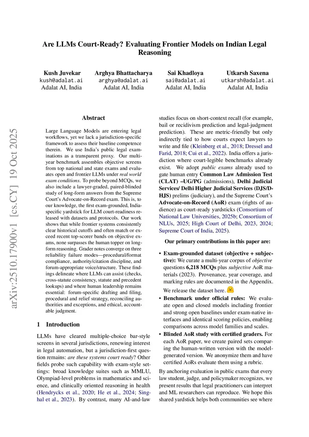 Large language models (LLMs) are entering legal workflows, yet we lack a jurisdiction-specific framework to assess their baseline competence therein. We use India's public legal examinations as a transparent proxy. Our multi-year benchmark assembles objective screens from top national and state exams and evaluates open and frontier LLMs under real-world exam conditions. To probe beyond multiple-choice questions, we also include a lawyer-graded, paired-blinded study of long-form answers from the Supreme Court's Advocate-on-Record exam. This is, to our knowledge, the first exam-grounded, India-specific yardstick for LLM court-readiness released with datasets and protocols. Our work shows that while frontier systems consistently clear historical cutoffs and often match or exceed recent top-scorer bands on objective exams, none surpasses the human topper on long-form reasoning. Grader notes converge on three reliability failure modes: procedural or format compliance, authority or citation discipline, and forum-appropriate voice and structure. These findings delineate where LLMs can assist (checks, cross-statute consistency, statute and precedent lookups) and where human leadership remains essential: forum-specific drafting and filing, procedural and relief strategy, reconciling authorities and exceptions, and ethical, accountable judgment.