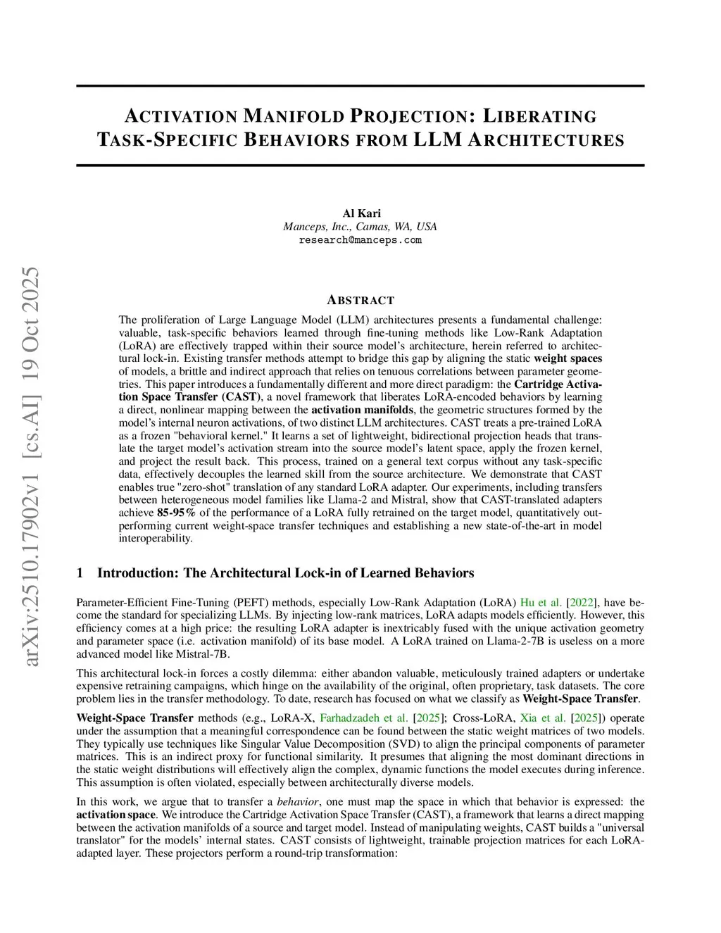 The proliferation of Large Language Model (LLM) architectures presents a fundamental challenge: valuable, task-specific behaviors learned through fine-tuning methods like Low-Rank Adaptation (LoRA) are effectively trapped within their source model's architecture, herein referred to architectural lock-in. Existing transfer methods attempt to bridge this gap by aligning the static weight spaces of models, a brittle and indirect approach that relies on tenuous correlations between parameter geometries. This paper introduces a fundamentally different and more direct paradigm: the Cartridge Activation Space Transfer (CAST), a novel framework that liberates LoRA-encoded behaviors by learning a direct, nonlinear mapping between the activation manifolds, the geometric structures formed by the model's internal neuron activations, of two distinct LLM architectures. CAST treats a pre-trained LoRA as a frozen "behavioral kernel." It learns a set of lightweight, bidirectional projection heads that translate the target model's activation stream into the source model's latent space, apply the frozen kernel, and project the result back. This process, trained on a general text corpus without any task-specific data, effectively decouples the learned skill from the source architecture. We demonstrate that CAST enables true "zero-shot" translation of any standard LoRA adapter. Our experiments, including transfers between heterogeneous model families like Llama-2 and Mistral, show that CAST-translated adapters achieve 85-95\% of the performance of a LoRA fully retrained on the target model, quantitatively outperforming current weight-space transfer techniques and establishing a new state-of-the-art in model interoperability.
