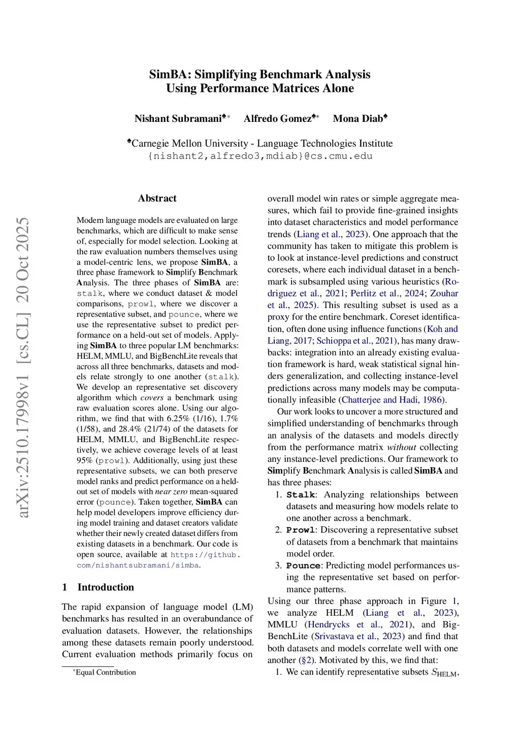 Modern language models are evaluated on large benchmarks, which are difficult to make sense of, especially for model selection. Looking at the raw evaluation numbers themselves using a model-centric lens, we propose SimBA, a three phase framework to Simplify Benchmark Analysis. The three phases of SimBA are: stalk, where we conduct dataset & model comparisons, prowl, where we discover a representative subset, and pounce, where we use the representative subset to predict performance on a held-out set of models. Applying SimBA to three popular LM benchmarks: HELM, MMLU, and BigBenchLite reveals that across all three benchmarks, datasets and models relate strongly to one another (stalk). We develop an representative set discovery algorithm which covers a benchmark using raw evaluation scores alone. Using our algorithm, we find that with 6.25% (1/16), 1.7% (1/58), and 28.4% (21/74) of the datasets for HELM, MMLU, and BigBenchLite respectively, we achieve coverage levels of at least 95% (prowl). Additionally, using just these representative subsets, we can both preserve model ranks and predict performance on a held-out set of models with near zero mean-squared error (pounce). Taken together, SimBA can help model developers improve efficiency during model training and dataset creators validate whether their newly created dataset differs from existing datasets in a benchmark. Our code is open source, available atthis https URL.