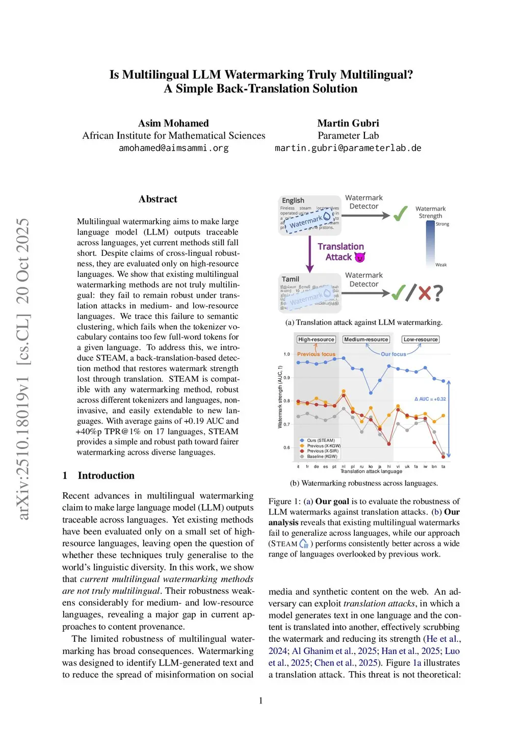 Multilingual watermarking aims to make large language model (LLM) outputs traceable across languages, yet current methods still fall short. Despite claims of cross-lingual robustness, they are evaluated only on high-resource languages. We show that existing multilingual watermarking methods are not truly multilingual: they fail to remain robust under translation attacks in medium- and low-resource languages. We trace this failure to semantic clustering, which fails when the tokenizer vocabulary contains too few full-word tokens for a given language. To address this, we introduce STEAM, a back-translation-based detection method that restores watermark strength lost through translation. STEAM is compatible with any watermarking method, robust across different tokenizers and languages, non-invasive, and easily extendable to new languages. With average gains of +0.19 AUC and +40%p TPR@1% on 17 languages, STEAM provides a simple and robust path toward fairer watermarking across diverse languages.