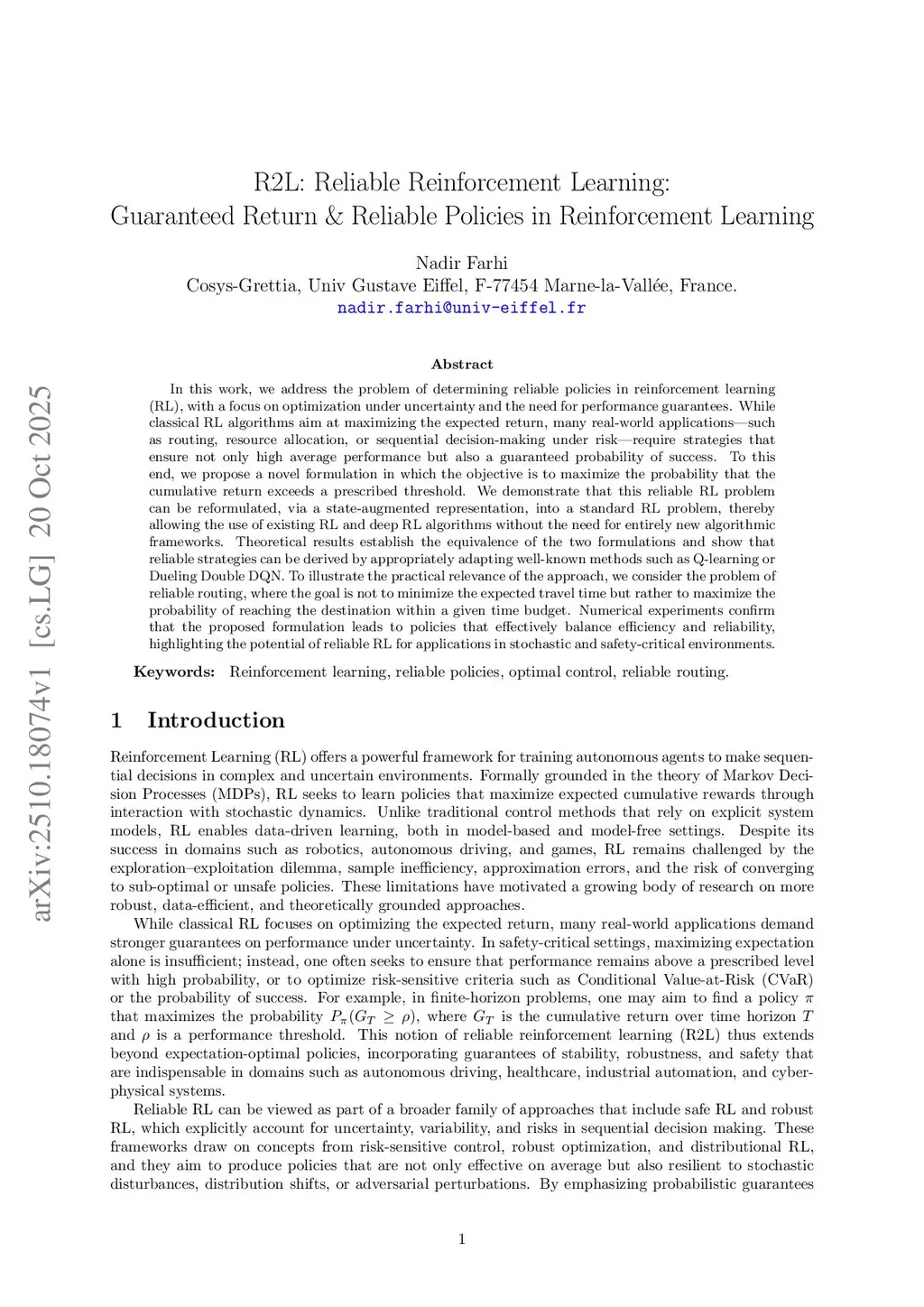 In this work, we address the problem of determining reliable policies in reinforcement learning (RL), with a focus on optimization under uncertainty and the need for performance guarantees. While classical RL algorithms aim at maximizing the expected return, many real-world applications - such as routing, resource allocation, or sequential decision-making under risk - require strategies that ensure not only high average performance but also a guaranteed probability of success. To this end, we propose a novel formulation in which the objective is to maximize the probability that the cumulative return exceeds a prescribed threshold. We demonstrate that this reliable RL problem can be reformulated, via a state-augmented representation, into a standard RL problem, thereby allowing the use of existing RL and deep RL algorithms without the need for entirely new algorithmic frameworks. Theoretical results establish the equivalence of the two formulations and show that reliable strategies can be derived by appropriately adapting well-known methods such as Q-learning or Dueling Double DQN. To illustrate the practical relevance of the approach, we consider the problem of reliable routing, where the goal is not to minimize the expected travel time but rather to maximize the probability of reaching the destination within a given time budget. Numerical experiments confirm that the proposed formulation leads to policies that effectively balance efficiency and reliability, highlighting the potential of reliable RL for applications in stochastic and safety-critical environments.