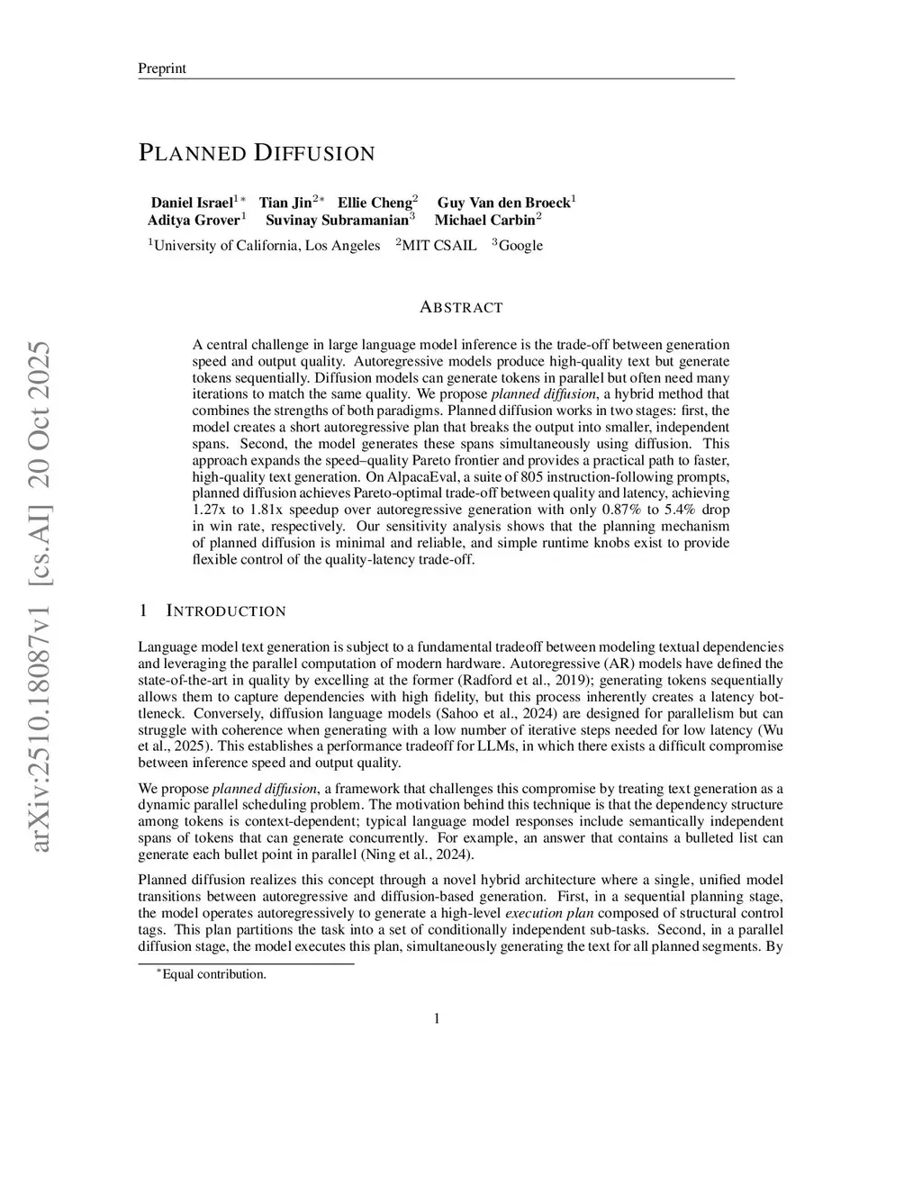 A central challenge in large language model inference is the trade-off between generation speed and output quality. Autoregressive models produce high-quality text but generate tokens sequentially. Diffusion models can generate tokens in parallel but often need many iterations to match the same quality. We propose planned diffusion, a hybrid method that combines the strengths of both paradigms. Planned diffusion works in two stages: first, the model creates a short autoregressive plan that breaks the output into smaller, independent spans. Second, the model generates these spans simultaneously using diffusion. This approach expands the speed-quality Pareto frontier and provides a practical path to faster, high-quality text generation. On AlpacaEval, a suite of 805 instruction-following prompts, planned diffusion achieves Pareto-optimal trade-off between quality and latency, achieving 1.27x to 1.81x speedup over autoregressive generation with only 0.87\% to 5.4\% drop in win rate, respectively. Our sensitivity analysis shows that the planning mechanism of planned diffusion is minimal and reliable, and simple runtime knobs exist to provide flexible control of the quality-latency trade-off.