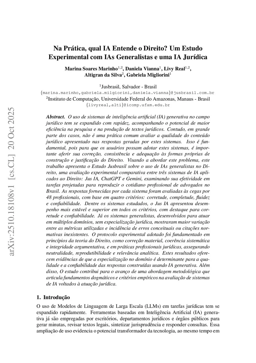 Na Prática, qual IA Entende o Direito? Um Estudo Experimental com IAs Generalistas e uma IA Jurídica