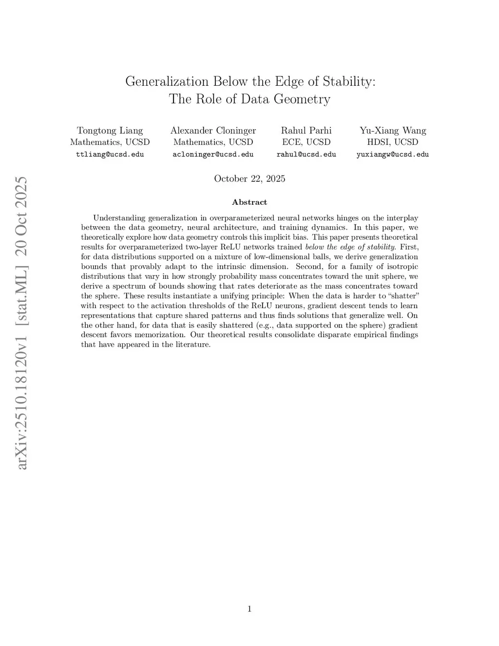 Understanding generalization in overparameterized neural networks hinges on the interplay between the data geometry, neural architecture, and training dynamics. In this paper, we theoretically explore how data geometry controls this implicit bias. This paper presents theoretical results for overparametrized two-layer ReLU networks trained below the edge of stability. First, for data distributions supported on a mixture of low-dimensional balls, we derive generalization bounds that provably adapt to the intrinsic dimension. Second, for a family of isotropic distributions that vary in how strongly probability mass concentrates toward the unit sphere, we derive a spectrum of bounds showing that rates deteriorate as the mass concentrates toward the sphere. These results instantiate a unifying principle: When the data is harder to "shatter" with respect to the activation thresholds of the ReLU neurons, gradient descent tends to learn representations that capture shared patterns and thus finds solutions that generalize well. On the other hand, for data that is easily shattered (e.g., data supported on the sphere) gradient descent favors memorization. Our theoretical results consolidate disparate empirical findings that have appeared in the literature.