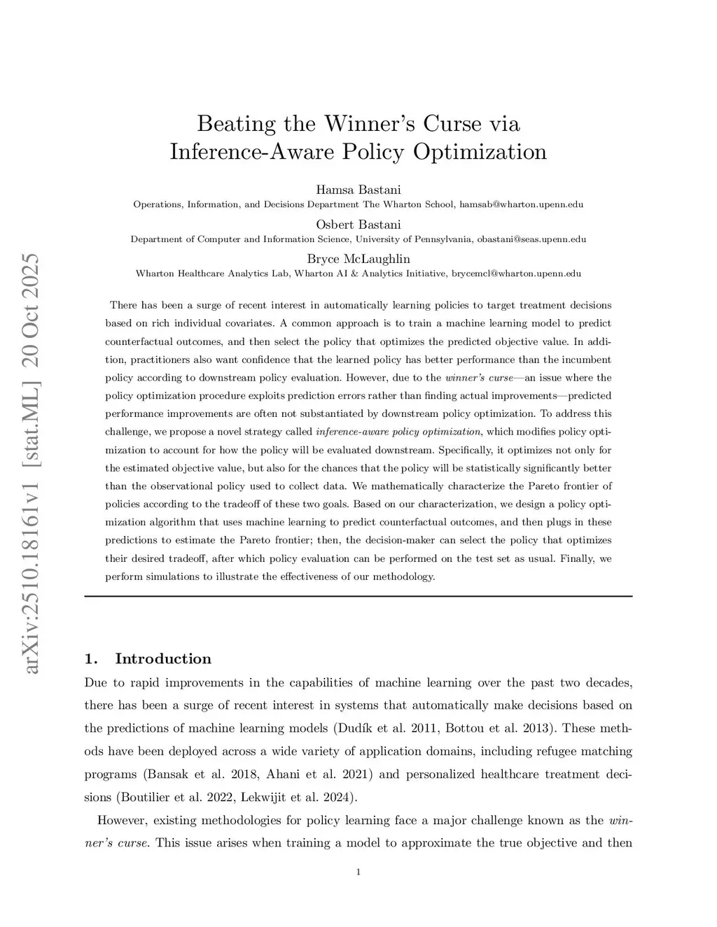 There has been a surge of recent interest in automatically learning policies to target treatment decisions based on rich individual covariates. In addition, practitioners want confidence that the learned policy has better performance than the incumbent policy according to downstream policy evaluation. However, due to the winner's curse -- an issue where the policy optimization procedure exploits prediction errors rather than finding actual improvements -- predicted performance improvements are often not substantiated by downstream policy evaluation. To address this challenge, we propose a novel strategy called inference-aware policy optimization, which modifies policy optimization to account for how the policy will be evaluated downstream. Specifically, it optimizes not only for the estimated objective value, but also for the chances that the estimate of the policy's improvement passes a significance test during downstream policy evaluation. We mathematically characterize the Pareto frontier of policies according to the tradeoff of these two goals. Based on our characterization, we design a policy optimization algorithm that estimates the Pareto frontier using machine learning models; then, the decision-maker can select the policy that optimizes their desired tradeoff, after which policy evaluation can be performed on the test set as usual. Finally, we perform simulations to illustrate the effectiveness of our methodology.