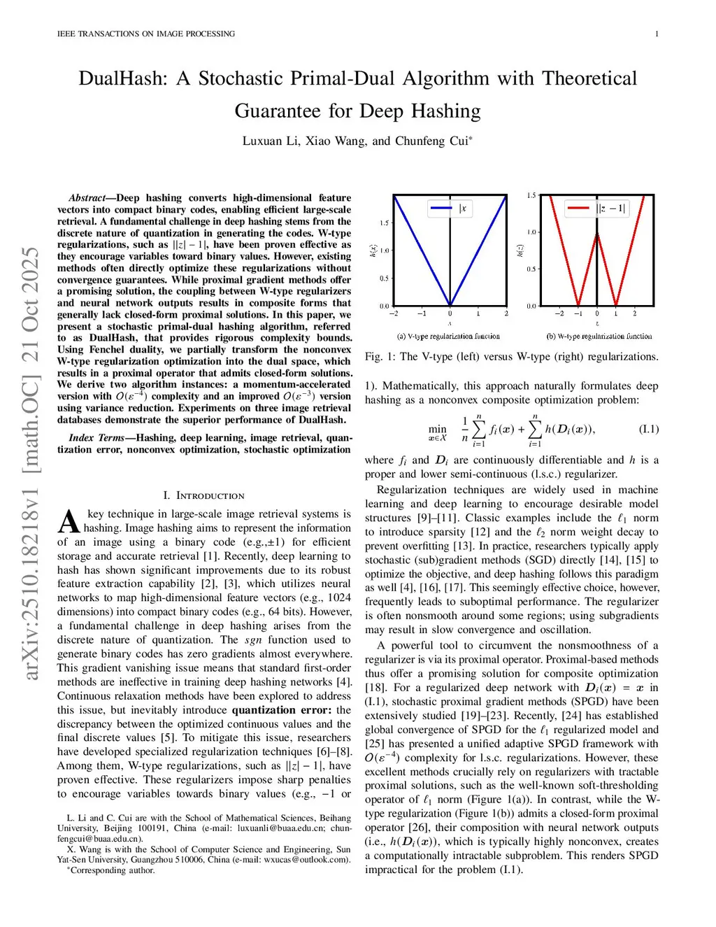 Deep hashing converts high-dimensional feature vectors into compact binary codes, enabling efficient large-scale retrieval. A fundamental challenge in deep hashing stems from the discrete nature of quantization in generating the codes. W-type regularizations, such as , have been proven effective as they encourage variables toward binary values. However, existing methods often directly optimize these regularizations without convergence guarantees. While proximal gradient methods offer a promising solution, the coupling between W-type regularizers and neural network outputs results in composite forms that generally lack closed-form proximal solutions. In this paper, we present a stochastic primal-dual hashing algorithm, referred to as DualHash, that provides rigorous complexity bounds. Using Fenchel duality, we partially transform the nonconvex W-type regularization optimization into the dual space, which results in a proximal operator that admits closed-form solutions. We derive two algorithm instances: a momentum-accelerated version with complexity and an improved version using variance reduction. Experiments on three image retrieval databases demonstrate the superior performance of DualHash.