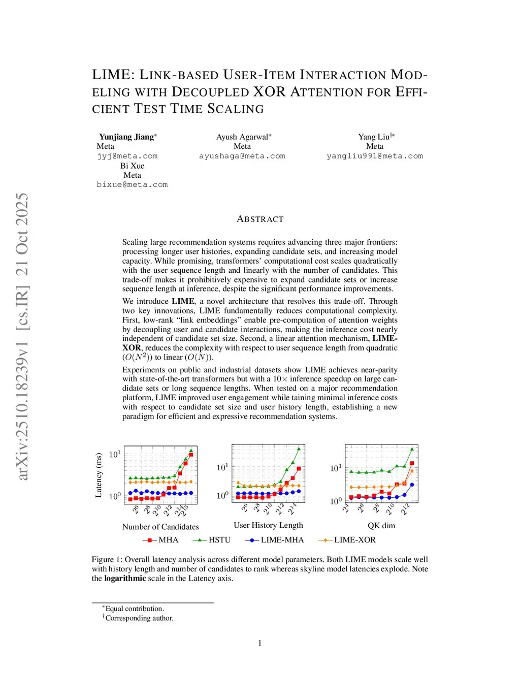 Scaling large recommendation systems requires advancing three major frontiers: processing longer user histories, expanding candidate sets, and increasing model capacity. While promising, transformers' computational cost scales quadratically with the user sequence length and linearly with the number of candidates. This trade-off makes it prohibitively expensive to expand candidate sets or increase sequence length at inference, despite the significant performance improvements.We introduce \textbf{LIME}, a novel architecture that resolves this trade-off. Through two key innovations, LIME fundamentally reduces computational complexity. First, low-rank ``link embeddings" enable pre-computation of attention weights by decoupling user and candidate interactions, making the inference cost nearly independent of candidate set size. Second, a linear attention mechanism, \textbf{LIME-XOR}, reduces the complexity with respect to user sequence length from quadratic () to linear ().Experiments on public and industrial datasets show LIME achieves near-parity with state-of-the-art transformers but with a 10 inference speedup on large candidate sets or long sequence lengths. When tested on a major recommendation platform, LIME improved user engagement while maintaining minimal inference costs with respect to candidate set size and user history length, establishing a new paradigm for efficient and expressive recommendation systems.