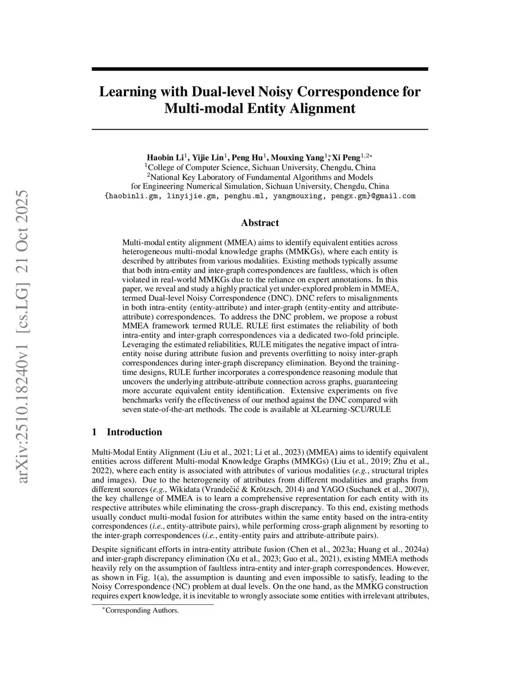 Multi-modal entity alignment (MMEA) aims to identify equivalent entities across heterogeneous multi-modal knowledge graphs (MMKGs), where each entity is described by attributes from various modalities. Existing methods typically assume that both intra-entity and inter-graph correspondences are faultless, which is often violated in real-world MMKGs due to the reliance on expert annotations. In this paper, we reveal and study a highly practical yet under-explored problem in MMEA, termed Dual-level Noisy Correspondence (DNC). DNC refers to misalignments in both intra-entity (entity-attribute) and inter-graph (entity-entity and attribute-attribute) correspondences. To address the DNC problem, we propose a robust MMEA framework termed RULE. RULE first estimates the reliability of both intra-entity and inter-graph correspondences via a dedicated two-fold principle. Leveraging the estimated reliabilities, RULE mitigates the negative impact of intra-entity noise during attribute fusion and prevents overfitting to noisy inter-graph correspondences during inter-graph discrepancy elimination. Beyond the training-time designs, RULE further incorporates a correspondence reasoning module that uncovers the underlying attribute-attribute connection across graphs, guaranteeing more accurate equivalent entity identification. Extensive experiments on five benchmarks verify the effectiveness of our method against the DNC compared with seven state-of-the-artthis http URLcode is available at \href{this https URL}{XLearning-SCU/RULE}