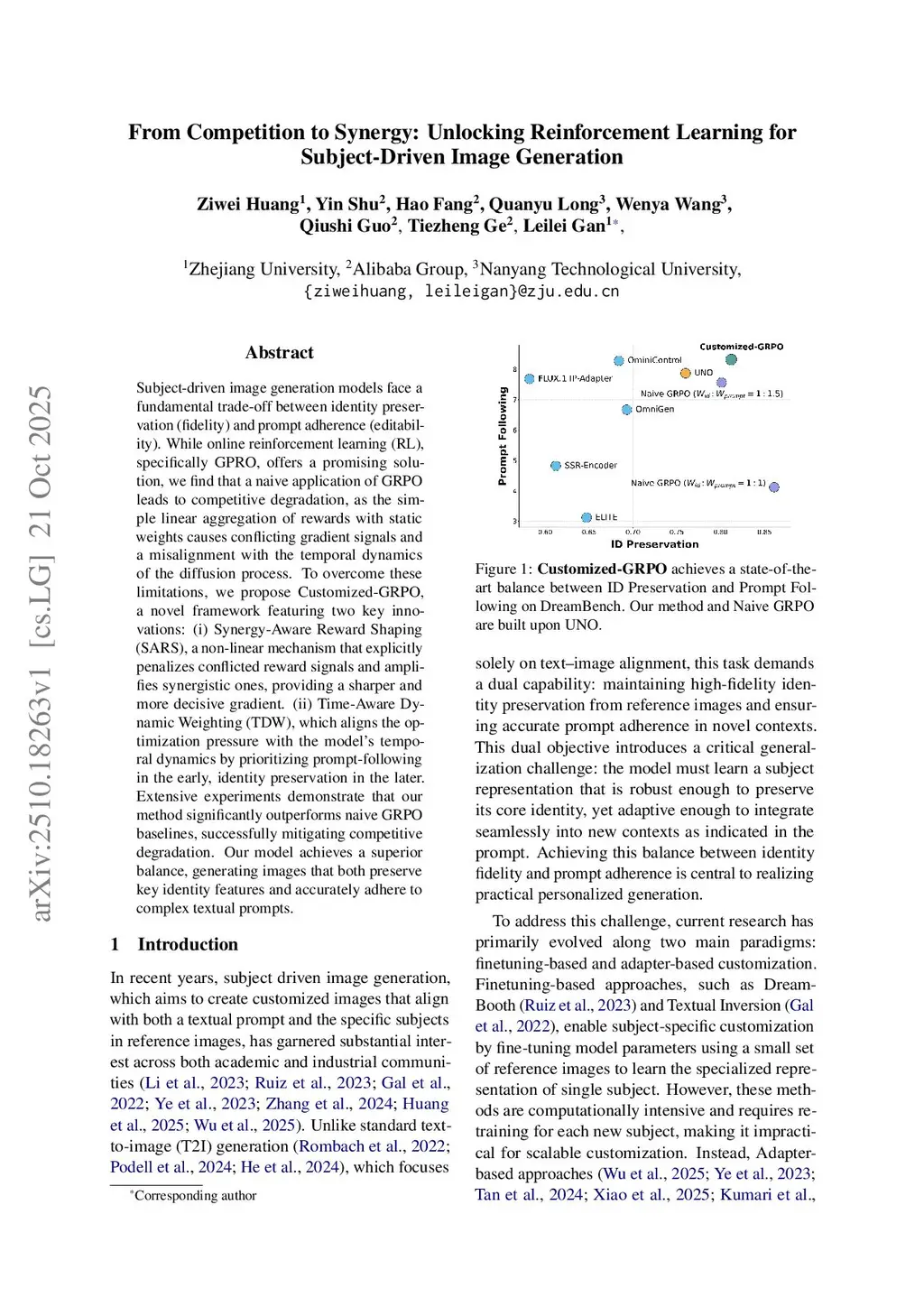 Subject-driven image generation models face a fundamental trade-off between identity preservation (fidelity) and prompt adherence (editability). While online reinforcement learning (RL), specifically GPRO, offers a promising solution, we find that a naive application of GRPO leads to competitive degradation, as the simple linear aggregation of rewards with static weights causes conflicting gradient signals and a misalignment with the temporal dynamics of the diffusion process. To overcome these limitations, we propose Customized-GRPO, a novel framework featuring two key innovations: (i) Synergy-Aware Reward Shaping (SARS), a non-linear mechanism that explicitly penalizes conflicted reward signals and amplifies synergistic ones, providing a sharper and more decisive gradient. (ii) Time-Aware Dynamic Weighting (TDW), which aligns the optimization pressure with the model's temporal dynamics by prioritizing prompt-following in the early, identity preservation in the later. Extensive experiments demonstrate that our method significantly outperforms naive GRPO baselines, successfully mitigating competitive degradation. Our model achieves a superior balance, generating images that both preserve key identity features and accurately adhere to complex textual prompts.