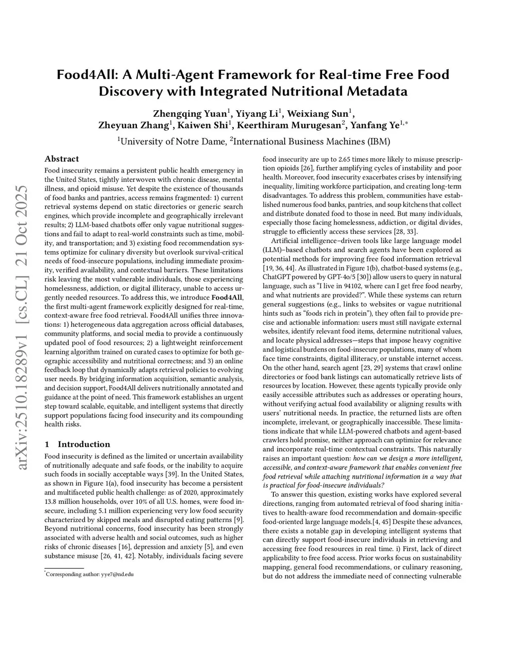 Food insecurity remains a persistent public health emergency in the United States, tightly interwoven with chronic disease, mental illness, and opioid misuse. Yet despite the existence of thousands of food banks and pantries, access remains fragmented: 1) current retrieval systems depend on static directories or generic search engines, which provide incomplete and geographically irrelevant results; 2) LLM-based chatbots offer only vague nutritional suggestions and fail to adapt to real-world constraints such as time, mobility, and transportation; and 3) existing food recommendation systems optimize for culinary diversity but overlook survival-critical needs of food-insecure populations, including immediate proximity, verified availability, and contextual barriers. These limitations risk leaving the most vulnerable individuals, those experiencing homelessness, addiction, or digital illiteracy, unable to access urgently needed resources. To address this, we introduce Food4All, the first multi-agent framework explicitly designed for real-time, context-aware free food retrieval. Food4All unifies three innovations: 1) heterogeneous data aggregation across official databases, community platforms, and social media to provide a continuously updated pool of food resources; 2) a lightweight reinforcement learning algorithm trained on curated cases to optimize for both geographic accessibility and nutritional correctness; and 3) an online feedback loop that dynamically adapts retrieval policies to evolving user needs. By bridging information acquisition, semantic analysis, and decision support, Food4All delivers nutritionally annotated and guidance at the point of need. This framework establishes an urgent step toward scalable, equitable, and intelligent systems that directly support populations facing food insecurity and its compounding health risks.