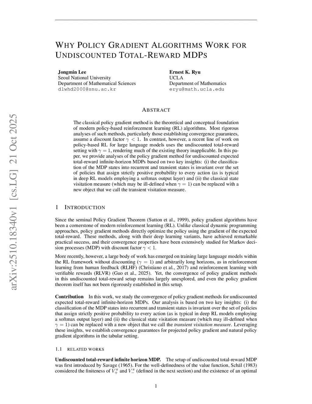 The classical policy gradient method is the theoretical and conceptual foundation of modern policy-based reinforcement learning (RL) algorithms. Most rigorous analyses of such methods, particularly those establishing convergence guarantees, assume a discount factor . In contrast, however, a recent line of work on policy-based RL for large language models uses the undiscounted total-reward setting with , rendering much of the existing theory inapplicable. In this paper, we provide analyses of the policy gradient method for undiscounted expected total-reward infinite-horizon MDPs based on two key insights: (i) the classification of the MDP states into recurrent and transient states is invariant over the set of policies that assign strictly positive probability to every action (as is typical in deep RL models employing a softmax output layer) and (ii) the classical state visitation measure (which may be ill-defined when ) can be replaced with a new object that we call the transient visitation measure.