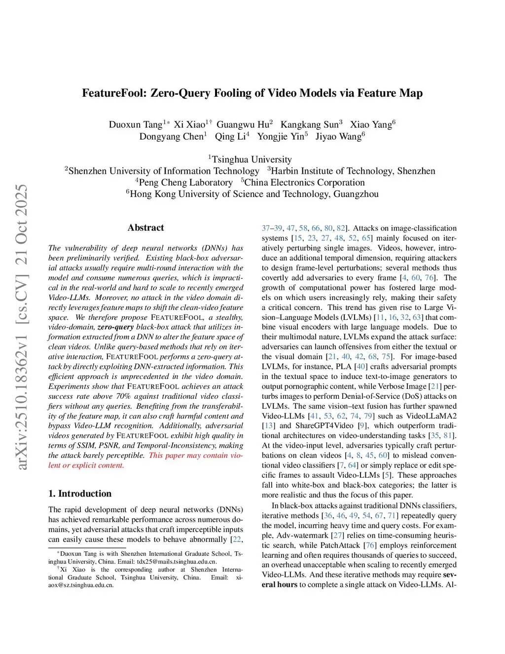 The vulnerability of deep neural networks (DNNs) has been preliminarily verified. Existing black-box adversarial attacks usually require multi-round interaction with the model and consume numerous queries, which is impractical in the real-world and hard to scale to recently emerged Video-LLMs. Moreover, no attack in the video domain directly leverages feature maps to shift the clean-video feature space. We therefore propose FeatureFool, a stealthy, video-domain, zero-query black-box attack that utilizes information extracted from a DNN to alter the feature space of clean videos. Unlike query-based methods that rely on iterative interaction, FeatureFool performs a zero-query attack by directly exploiting DNN-extracted information. This efficient approach is unprecedented in the video domain. Experiments show that FeatureFool achieves an attack success rate above 70\% against traditional video classifiers without any queries. Benefiting from the transferability of the feature map, it can also craft harmful content and bypass Video-LLM recognition. Additionally, adversarial videos generated by FeatureFool exhibit high quality in terms of SSIM, PSNR, and Temporal-Inconsistency, making the attack barely perceptible. This paper may contain violent or explicit content.