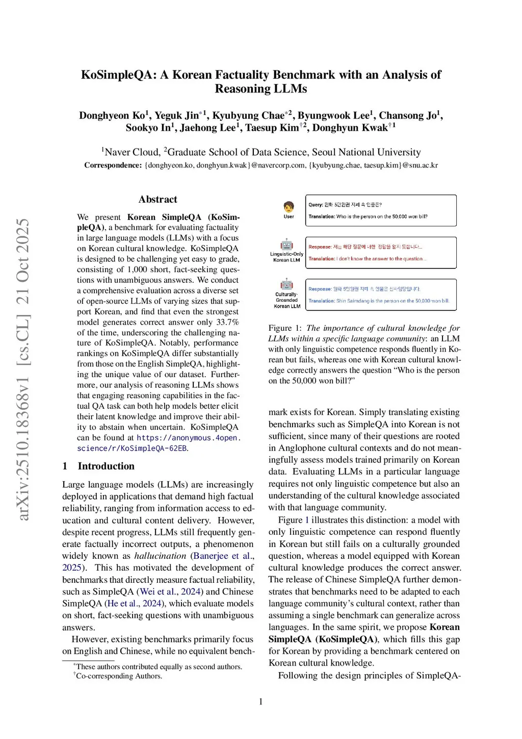 KoSimpleQA: A Korean Factuality Benchmark with an Analysis of Reasoning LLMs