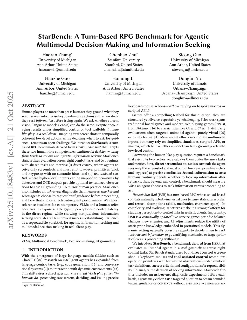 Human players do more than press buttons: they ground what they see on screen into precise keyboard-mouse actions and, when stuck, they seek information before trying again. We ask whether current vision-language models (VLMs) can do the same. Despite encouraging results under simplified control or tool scaffolds, human-like play in a real client - mapping raw screenshots to temporally coherent low-level actions while deciding when to ask for guidance - remains an open challenge. We introduce StarBench, a turn-based RPG benchmark derived from Honkai: Star Rail that targets these two human-like competencies: multimodal decision-making from pixels to actions and agentic information seeking. StarBench standardizes evaluation across eight combat tasks and two regimes with shared tasks and metrics: (i) direct control, where agents receive only screenshots and must emit low-level primitives (click and keypress) with no semantic hints; and (ii) tool-assisted control, where higher-level intents can be mapped to primitives by detectors and OCR outputs provide optional textualized observations to ease UI grounding. To mirror human practice, StarBench also includes an ask-or-act diagnostic that measures whether and when agents choose to request brief guidance before proceeding, and how that choice affects subsequent performance. We report reference baselines for contemporary VLMs and a human reference. Results expose sizable gaps in perception-to-control fidelity in the direct regime, while showing that judicious information seeking correlates with improved success, establishing StarBench as a reproducible yardstick for agentic information seeking and multimodal decision-making in real-client play.