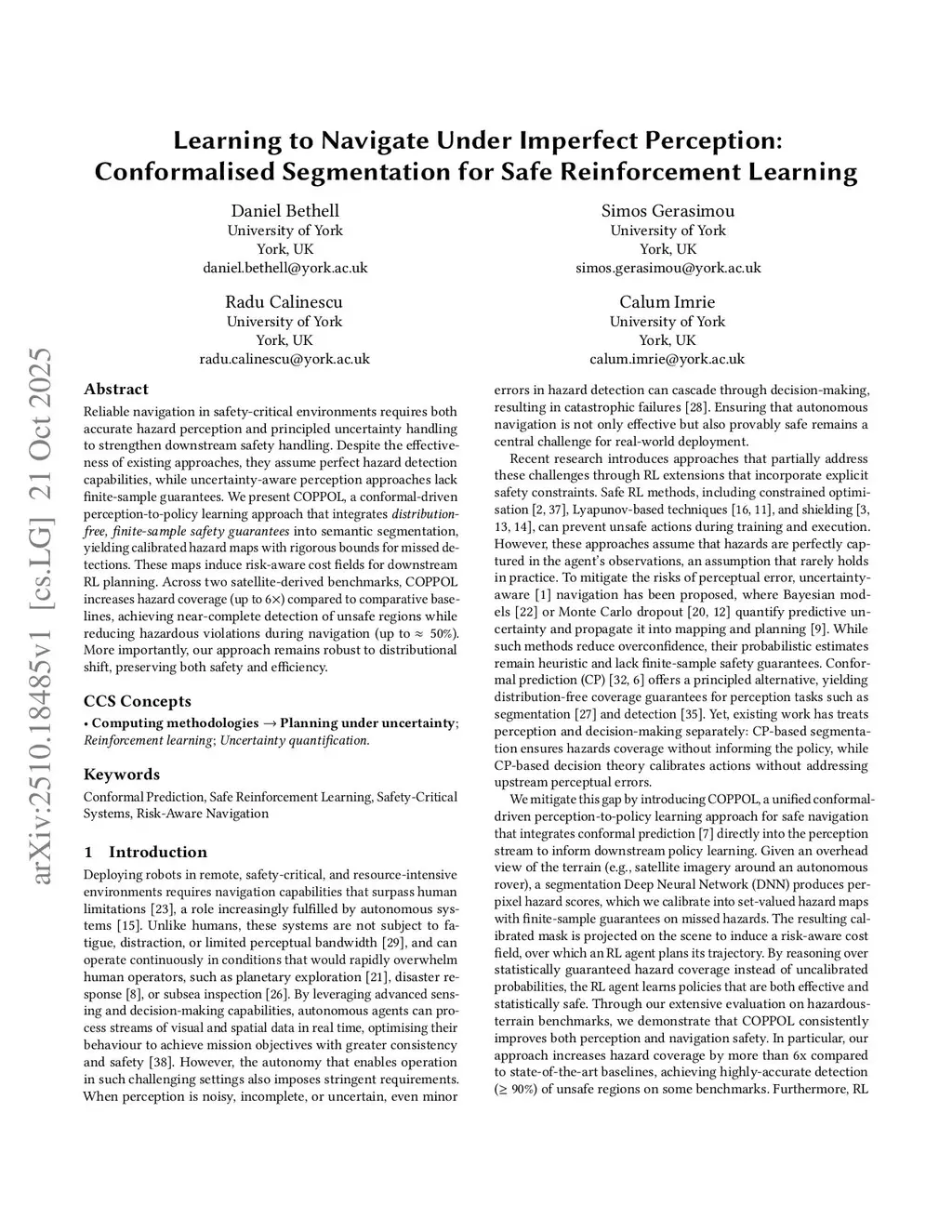 Reliable navigation in safety-critical environments requires both accurate hazard perception and principled uncertainty handling to strengthen downstream safety handling. Despite the effectiveness of existing approaches, they assume perfect hazard detection capabilities, while uncertainty-aware perception approaches lack finite-sample guarantees. We present COPPOL, a conformal-driven perception-to-policy learning approach that integrates distribution-free, finite-sample safety guarantees into semantic segmentation, yielding calibrated hazard maps with rigorous bounds for missed detections. These maps induce risk-aware cost fields for downstream RL planning. Across two satellite-derived benchmarks, COPPOL increases hazard coverage (up to 6x) compared to comparative baselines, achieving near-complete detection of unsafe regions while reducing hazardous violations during navigation (up to approx 50%). More importantly, our approach remains robust to distributional shift, preserving both safety and efficiency.