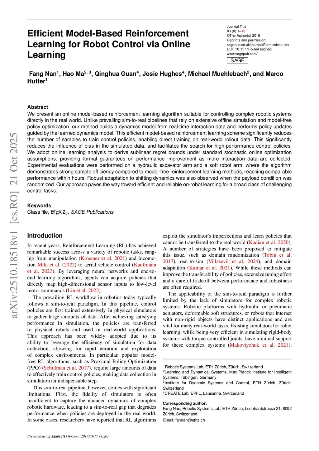 Efficient Model-Based Reinforcement Learning for Robot Control via Online Learning