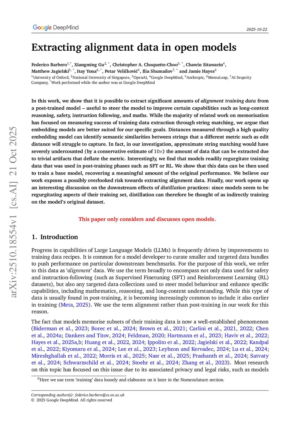 In this work, we show that it is possible to extract significant amounts of alignment training data from a post-trained model -- useful to steer the model to improve certain capabilities such as long-context reasoning, safety, instruction following, and maths. While the majority of related work on memorisation has focused on measuring success of training data extraction through string matching, we argue that embedding models are better suited for our specific goals. Distances measured through a high quality embedding model can identify semantic similarities between strings that a different metric such as edit distance will struggle to capture. In fact, in our investigation, approximate string matching would have severely undercounted (by a conservative estimate of ) the amount of data that can be extracted due to trivial artifacts that deflate the metric. Interestingly, we find that models readily regurgitate training data that was used in post-training phases such as SFT or RL. We show that this data can be then used to train a base model, recovering a meaningful amount of the original performance. We believe our work exposes a possibly overlooked risk towards extracting alignment data. Finally, our work opens up an interesting discussion on the downstream effects of distillation practices: since models seem to be regurgitating aspects of their training set, distillation can therefore be thought of as indirectly training on the model's original dataset.
