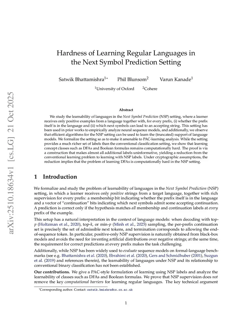 We study the learnability of languages in the Next Symbol Prediction (NSP) setting, where a learner receives only positive examples from a language together with, for every prefix, (i) whether the prefix itself is in the language and (ii) which next symbols can lead to an accepting string. This setting has been used in prior works to empirically analyze neural sequence models, and additionally, we observe that efficient algorithms for the NSP setting can be used to learn the (truncated) support of language models. We formalize the setting so as to make it amenable to PAC-learning analysis. While the setting provides a much richer set of labels than the conventional classification setting, we show that learning concept classes such as DFAs and Boolean formulas remains computationally hard. The proof is via a construction that makes almost all additional labels uninformative, yielding a reduction from the conventional learning problem to learning with NSP labels. Under cryptographic assumptions, the reduction implies that the problem of learning DFAs is computationally hard in the NSP setting.