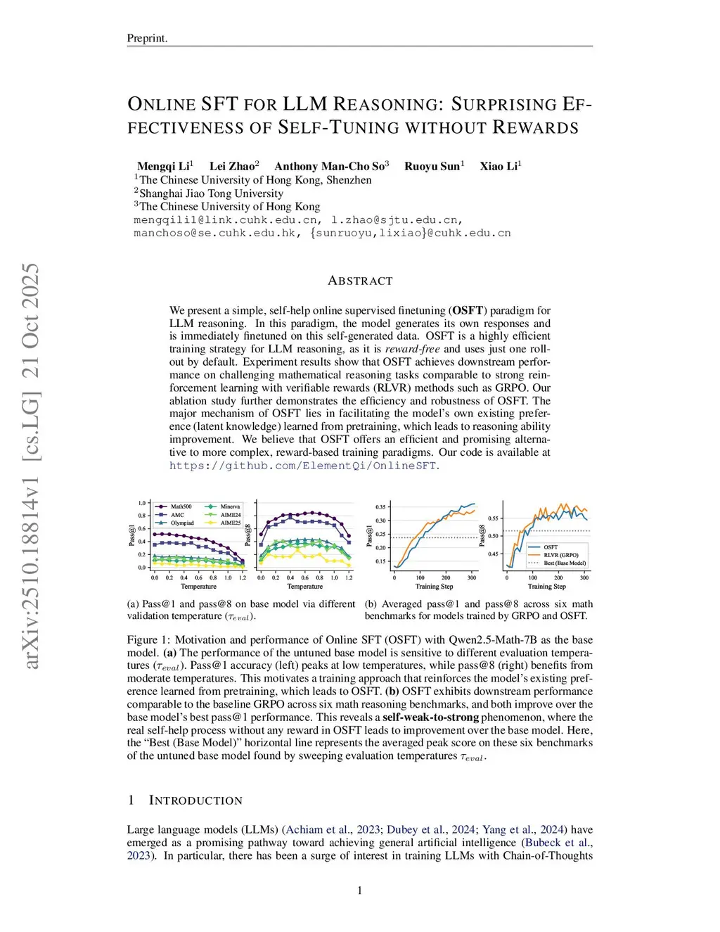 We present a simple, self-help online supervised finetuning (OSFT) paradigm for LLM reasoning. In this paradigm, the model generates its own responses and is immediately finetuned on this self-generated data. OSFT is a highly efficient training strategy for LLM reasoning, as it is reward-free and uses just one rollout by default. Experiment results show that OSFT achieves downstream performance on challenging mathematical reasoning tasks comparable to strong reinforcement learning with verifiable rewards (RLVR) methods such as GRPO. Our ablation study further demonstrates the efficiency and robustness of OSFT. The major mechanism of OSFT lies in facilitating the model's own existing preference (latent knowledge) learned from pretraining, which leads to reasoning ability improvement. We believe that OSFT offers an efficient and promising alternative to more complex, reward-based training paradigms. Our code is available atthis https URL.