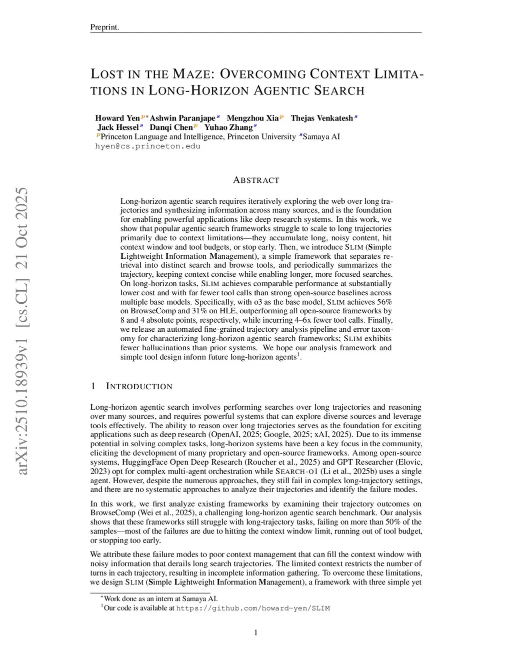 Long-horizon agentic search requires iteratively exploring the web over long trajectories and synthesizing information across many sources, and is the foundation for enabling powerful applications like deep research systems. In this work, we show that popular agentic search frameworks struggle to scale to long trajectories primarily due to context limitations-they accumulate long, noisy content, hit context window and tool budgets, or stop early. Then, we introduce SLIM (Simple Lightweight Information Management), a simple framework that separates retrieval into distinct search and browse tools, and periodically summarizes the trajectory, keeping context concise while enabling longer, more focused searches. On long-horizon tasks, SLIM achieves comparable performance at substantially lower cost and with far fewer tool calls than strong open-source baselines across multiple base models. Specifically, with o3 as the base model, SLIM achieves 56% on BrowseComp and 31% on HLE, outperforming all open-source frameworks by 8 and 4 absolute points, respectively, while incurring 4-6x fewer tool calls. Finally, we release an automated fine-grained trajectory analysis pipeline and error taxonomy for characterizing long-horizon agentic search frameworks; SLIM exhibits fewer hallucinations than prior systems. We hope our analysis framework and simple tool design inform future long-horizon agents.