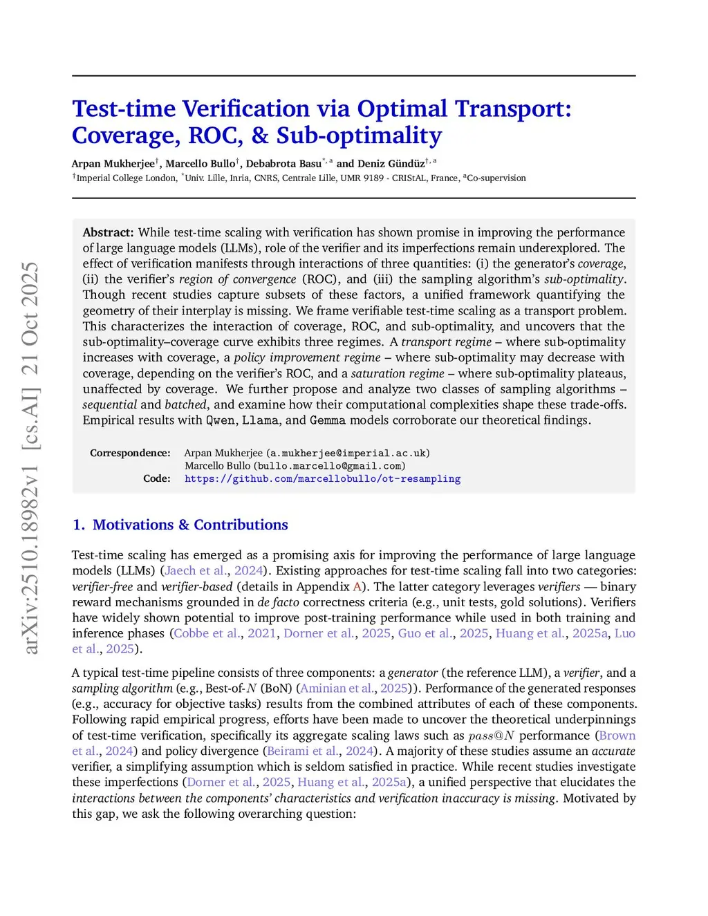 While test-time scaling with verification has shown promise in improving the performance of large language models (LLMs), the role of the verifier and its imperfections remain underexplored. The effect of verification manifests through interactions of three quantities: (i) the generator's coverage, (ii) the verifier's region of convergence (ROC), and (iii) the sampling algorithm's sub-optimality. Though recent studies capture subsets of these factors, a unified framework quantifying the geometry of their interplay is missing. We frame verifiable test-time scaling as a transport problem. This characterizes the interaction of coverage, ROC, and sub-optimality, and uncovers that the sub-optimality--coverage curve exhibits three regimes. A transport regime -- where sub-optimality increases with coverage, a policy improvement regime -- where sub-optimality may decrease with coverage, depending on the verifier's ROC, and a saturation regime -- where sub-optimality plateaus, unaffected by coverage. We further propose and analyze two classes of sampling algorithms -- sequential and batched, and examine how their computational complexities shape these trade-offs. Empirical results with Qwen, Llama, and Gemma models corroborate our theoretical findings.