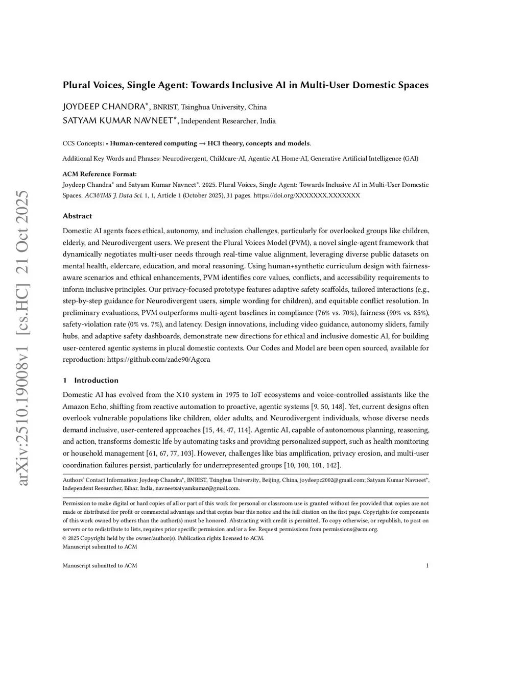 Domestic AI agents faces ethical, autonomy, and inclusion challenges, particularly for overlooked groups like children, elderly, and Neurodivergent users. We present the Plural Voices Model (PVM), a novel single-agent framework that dynamically negotiates multi-user needs through real-time value alignment, leveraging diverse public datasets on mental health, eldercare, education, and moral reasoning. Using human+synthetic curriculum design with fairness-aware scenarios and ethical enhancements, PVM identifies core values, conflicts, and accessibility requirements to inform inclusive principles. Our privacy-focused prototype features adaptive safety scaffolds, tailored interactions (e.g., step-by-step guidance for Neurodivergent users, simple wording for children), and equitable conflict resolution. In preliminary evaluations, PVM outperforms multi-agent baselines in compliance (76% vs. 70%), fairness (90% vs. 85%), safety-violation rate (0% vs. 7%), and latency. Design innovations, including video guidance, autonomy sliders, family hubs, and adaptive safety dashboards, demonstrate new directions for ethical and inclusive domestic AI, for building user-centered agentic systems in plural domestic contexts. Our Codes and Model are been open sourced, available for reproduction:this https URL