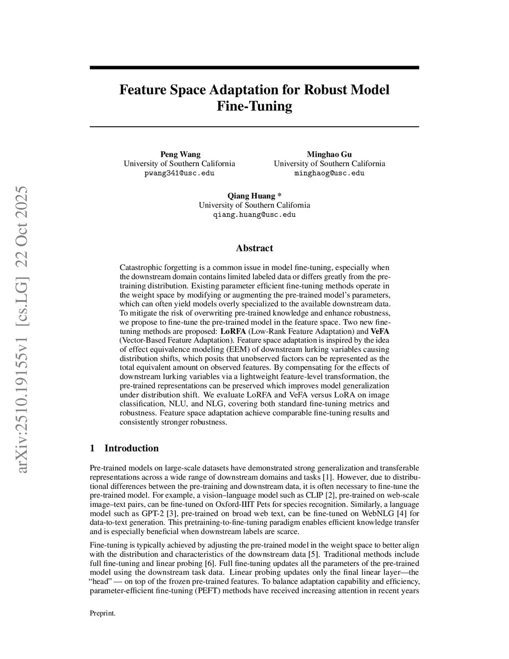 Catastrophic forgetting is a well-documented challenge in model fine-tuning, particularly when the downstream domain has limited labeled data or differs substantially from the pre-training distribution. Existing parameter-efficient fine-tuning methods largely operate in the weight space by modifying or augmenting the parameters of the pre-trained model, which can lead to models that are overly specialized to the observed downstream data. Recent studies suggest that one mechanism underlying such forgetting is the introduction of intruder dimensions into the representation space during fine-tuning. To mitigate the risk of overwriting pre-trained knowledge and to enhance robustness, we propose Vector-based Feature Adaptation (VeFA), a new fine-tuning method that operates directly in the feature space, which naturally avoids generating intruder dimensions. VeFA performs element-wise adaptation on individual features, thereby ensuring that the effective fine-tuned weights always remain within the column space of the pre-trained weight matrix. This feature-space adaptation perspective is inspired by the idea of effect equivalence modeling (EEM) of downstream lurking variables that induce distribution shifts, which posits that the influence of unobserved factors can be represented as an equivalent aggregate effect on observed features. By compensating for the effects of downstream lurking variables via a lightweight feature-level transformation, VeFA preserves the pre-trained representations and improves model generalization under distribution shift. We evaluate VeFA against LoRA on image classification, NLU, and NLG benchmarks, considering both standard fine-tuning performance and robustness; across these tasks, VeFA achieves comparable fine-tuning performance while consistently exhibiting stronger robustness.