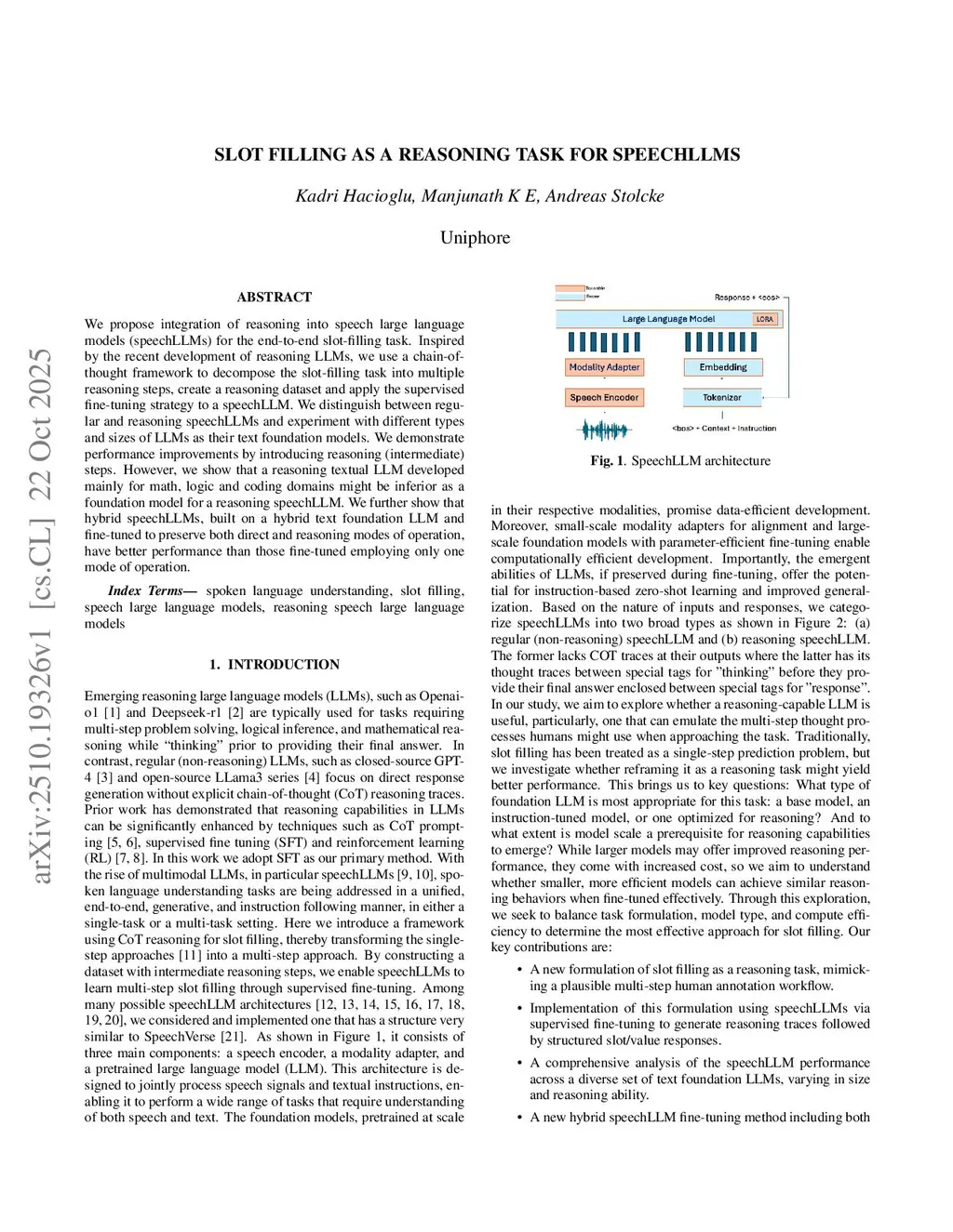 Slot Filling as a Reasoning Task for SpeechLLMs