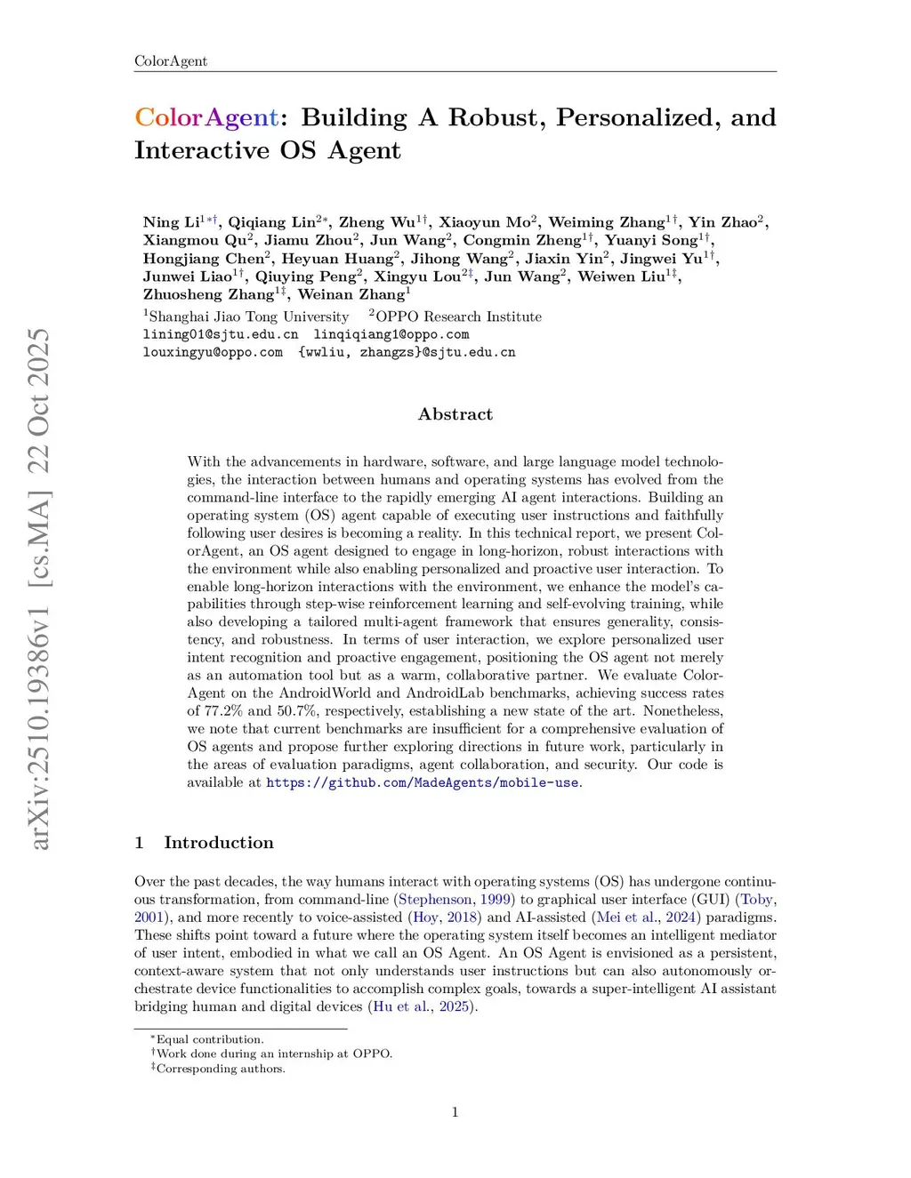 With the advancements in hardware, software, and large language model technologies, the interaction between humans and operating systems has evolved from the command-line interface to the rapidly emerging AI agent interactions. Building an operating system (OS) agent capable of executing user instructions and faithfully following user desires is becoming a reality. In this technical report, we present ColorAgent, an OS agent designed to engage in long-horizon, robust interactions with the environment while also enabling personalized and proactive user interaction. To enable long-horizon interactions with the environment, we enhance the model's capabilities through step-wise reinforcement learning and self-evolving training, while also developing a tailored multi-agent framework that ensures generality, consistency, and robustness. In terms of user interaction, we explore personalized user intent recognition and proactive engagement, positioning the OS agent not merely as an automation tool but as a warm, collaborative partner. We evaluate ColorAgent on the AndroidWorld and AndroidLab benchmarks, achieving success rates of 77.2% and 50.7%, respectively, establishing a new state of the art. Nonetheless, we note that current benchmarks are insufficient for a comprehensive evaluation of OS agents and propose further exploring directions in future work, particularly in the areas of evaluation paradigms, agent collaboration, and security.